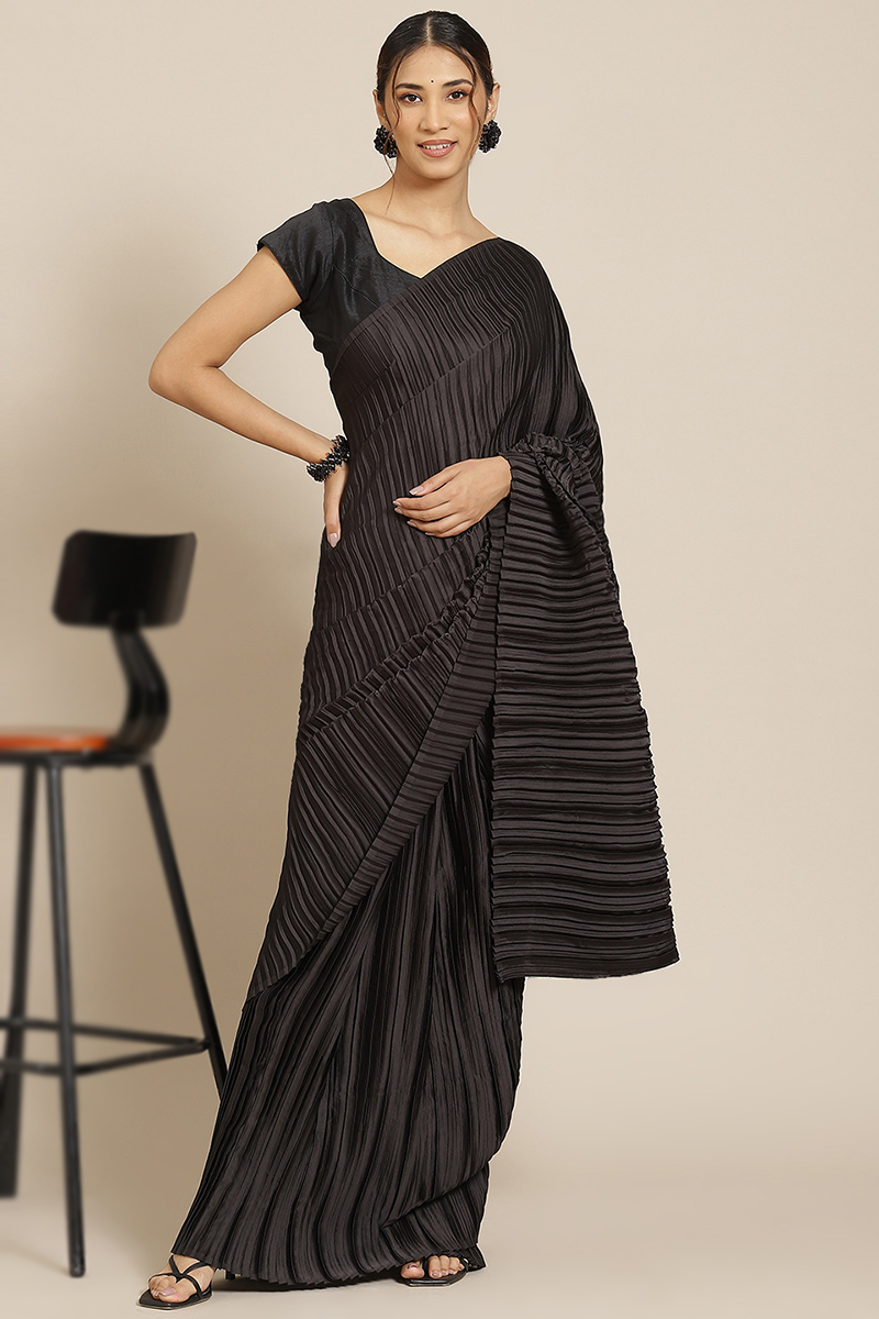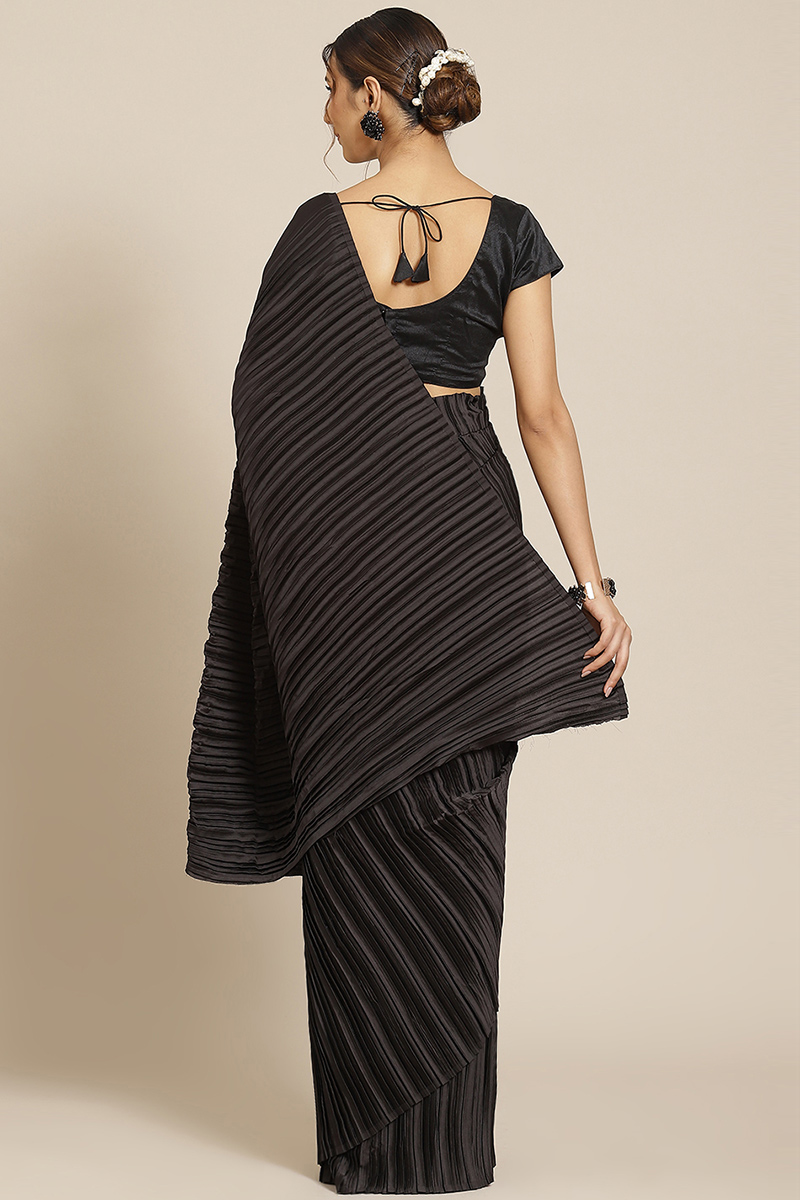 Black Satin Silk Pleated Saree