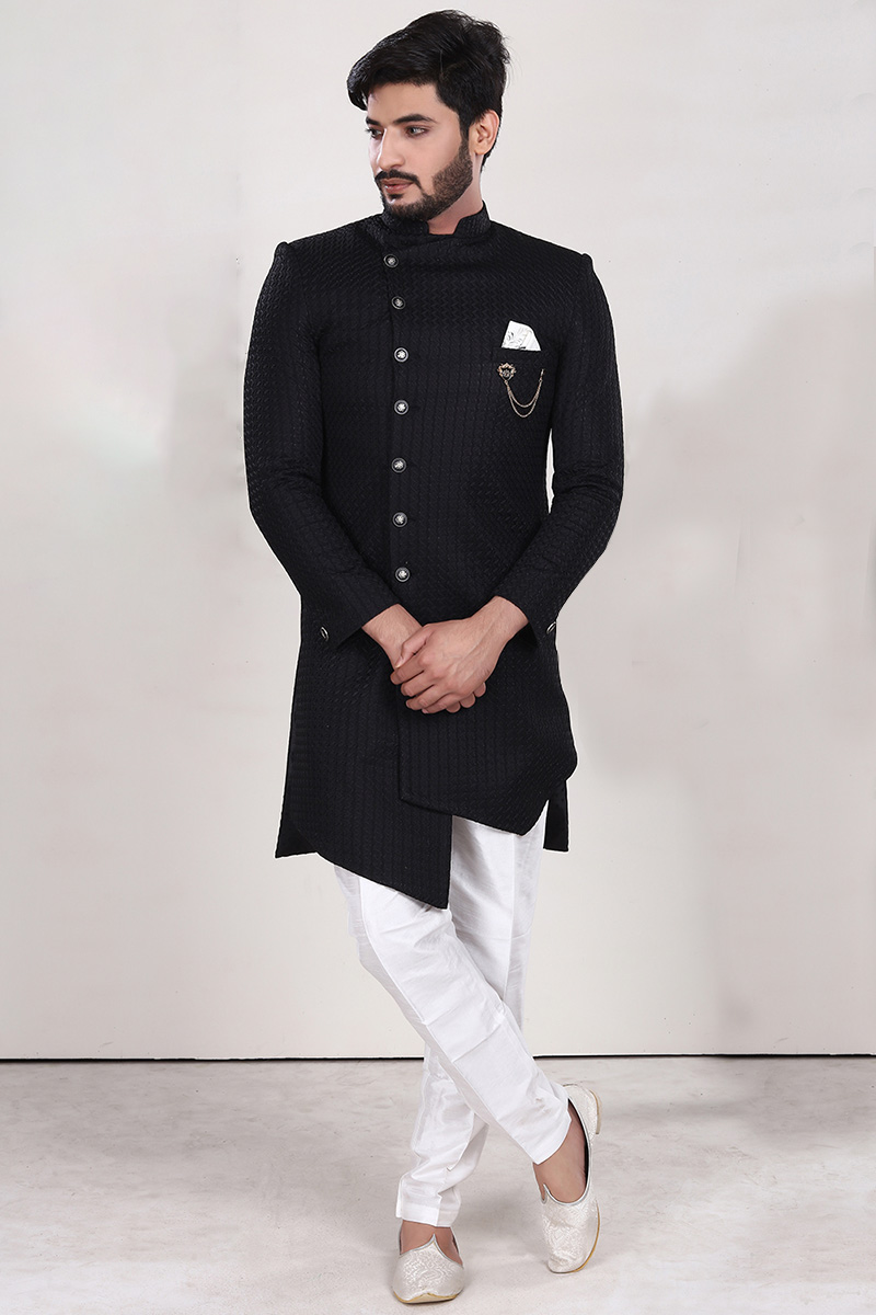 Black Contemporary Silk Straight Pant Men Sherwani With plain pajama pants.