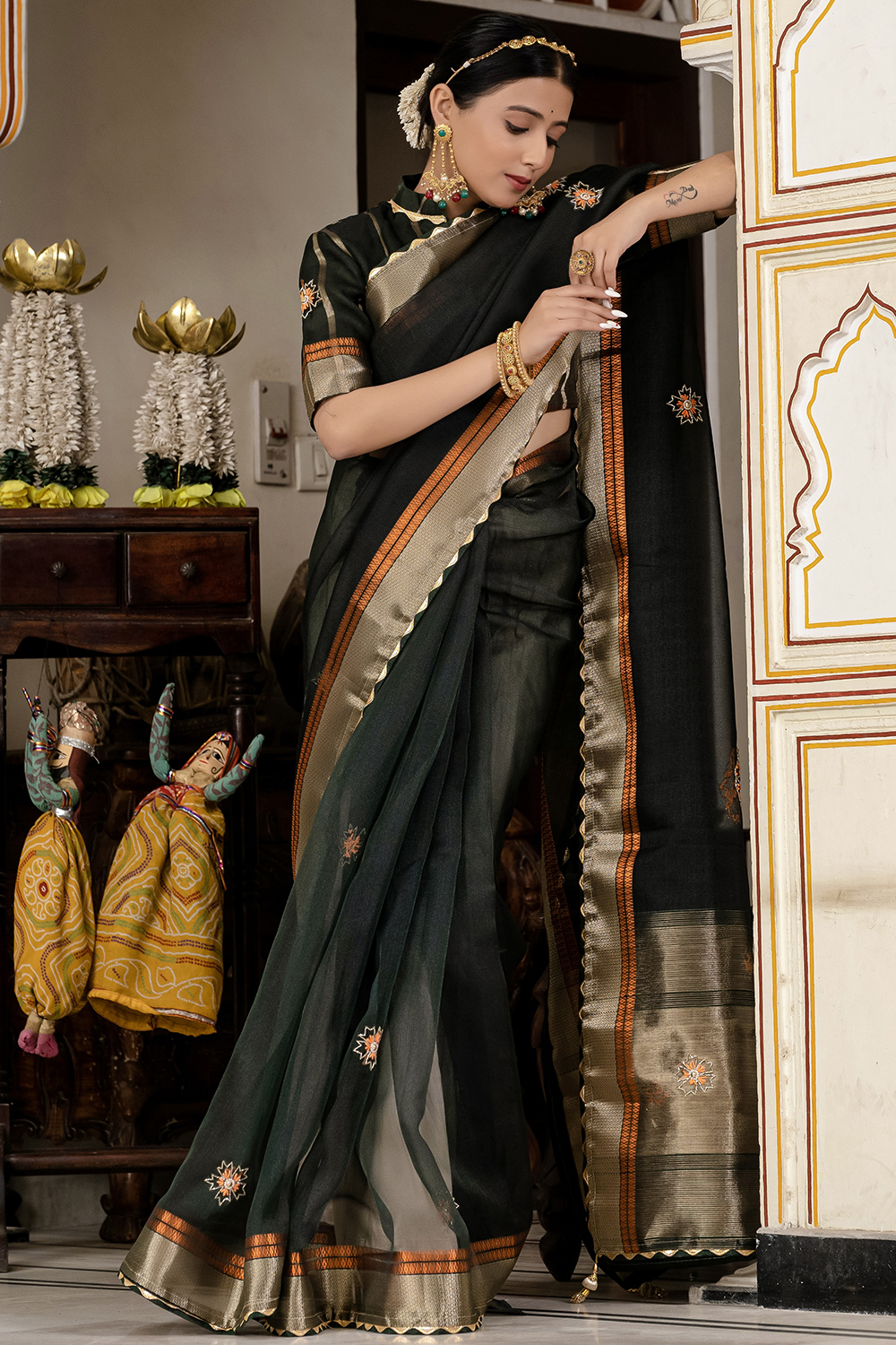 It is available with tissue light weight saree in black color prettified with pearl, cutdana, resham thread and woven zari work.