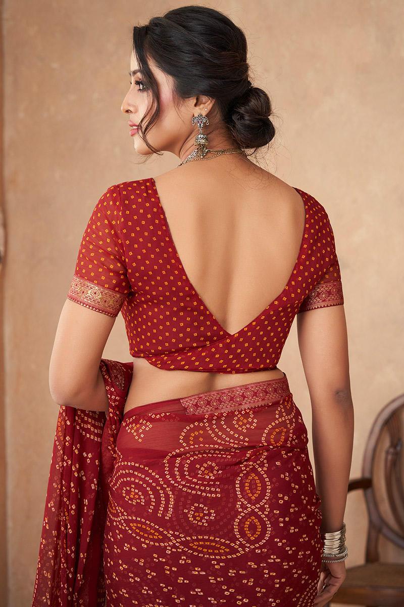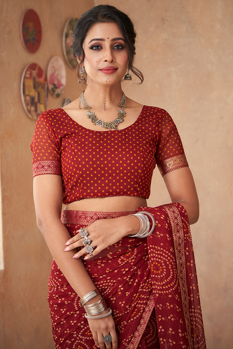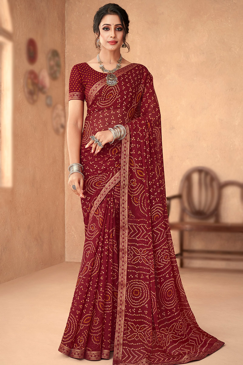 It is present with chiffon bandhani saree in burgundy maroon color designed with lace and printed work.