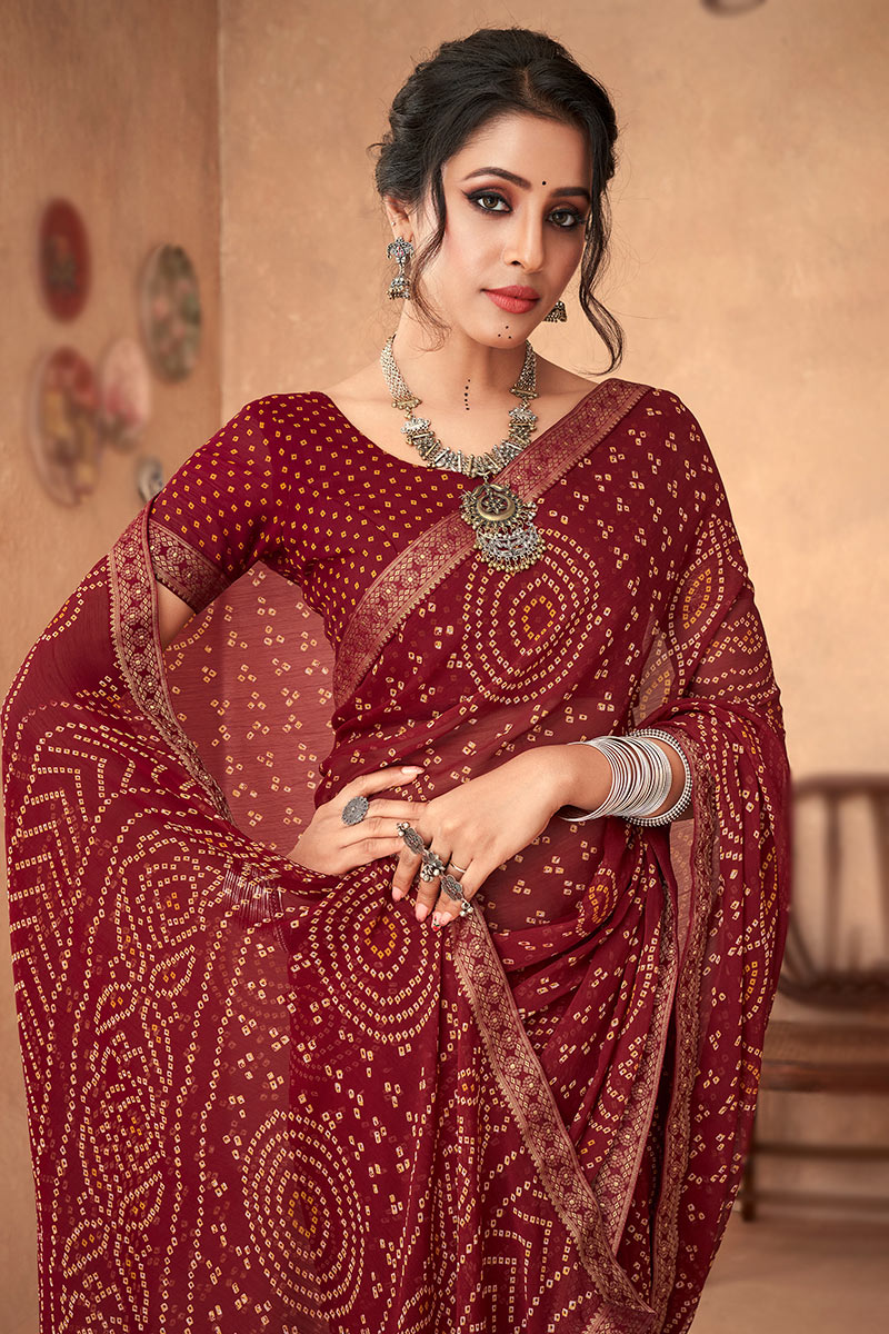 Burgundy Maroon Casual Wear Printed Saree in Chiffon
