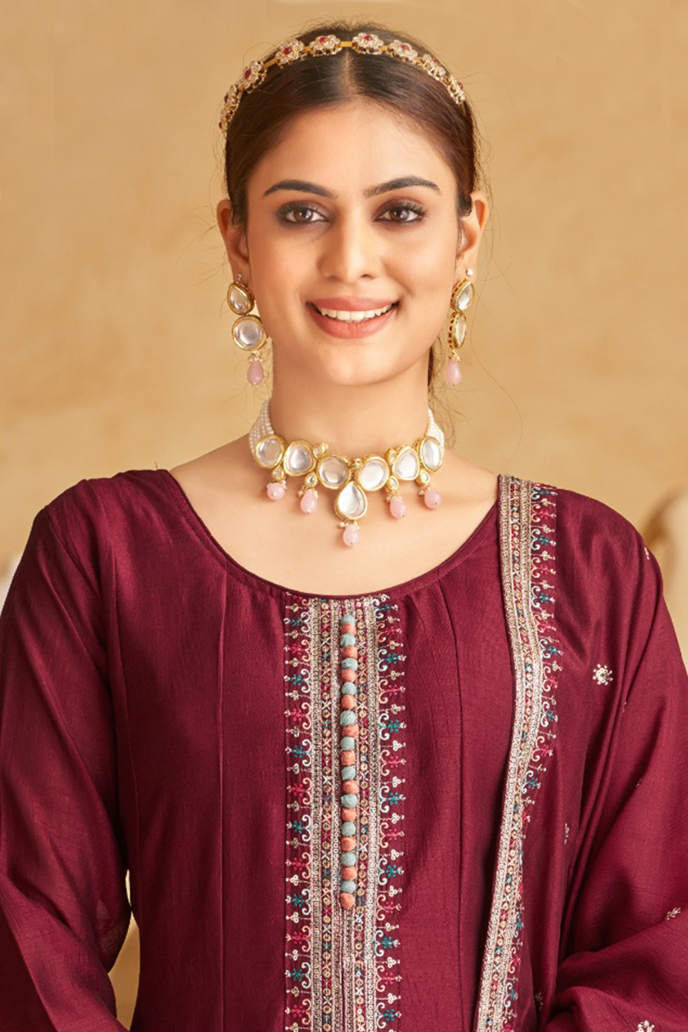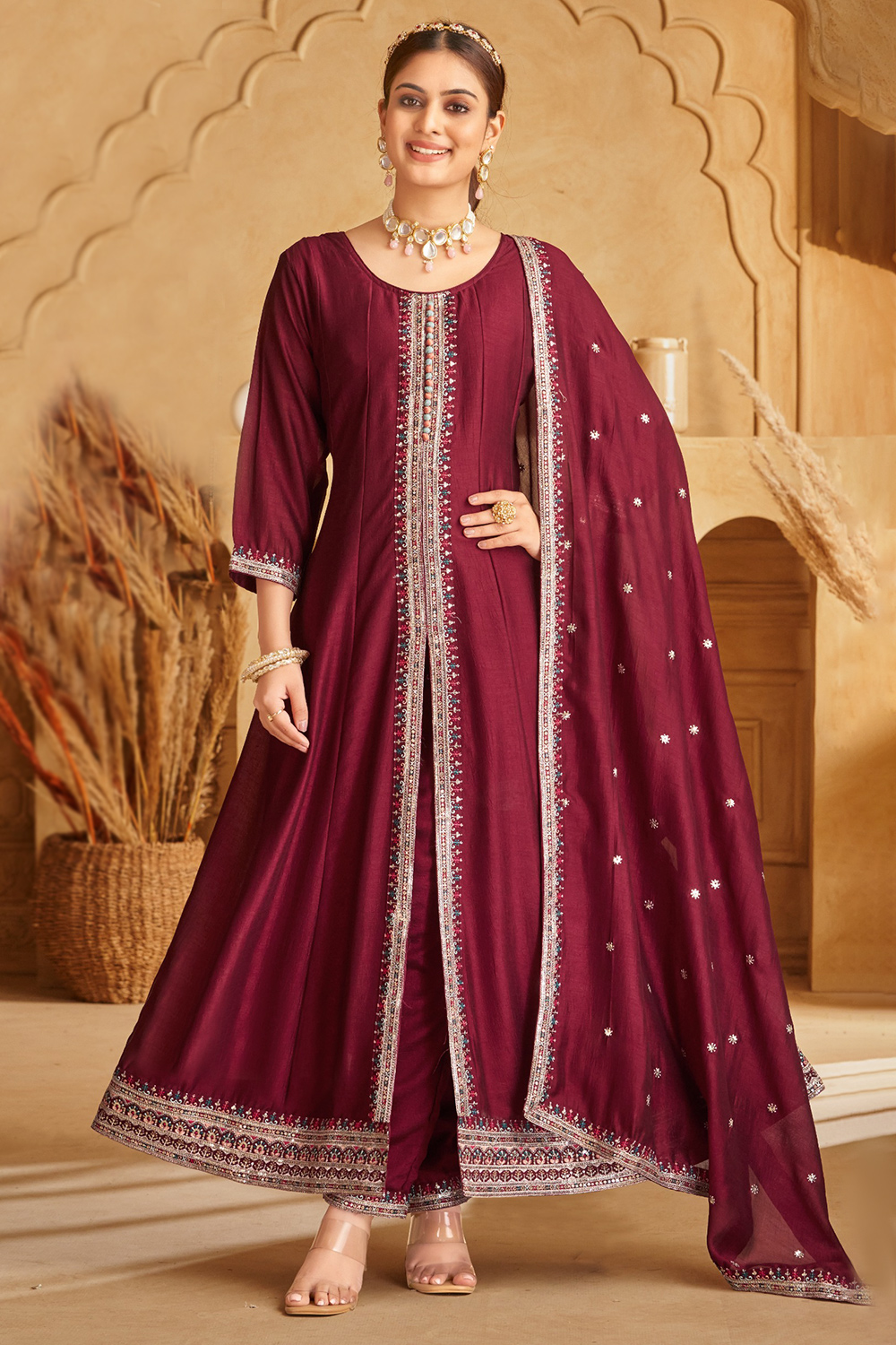 Burgundy Maroon Cotton Silk Embroidered Front Slit Ready Made Suit