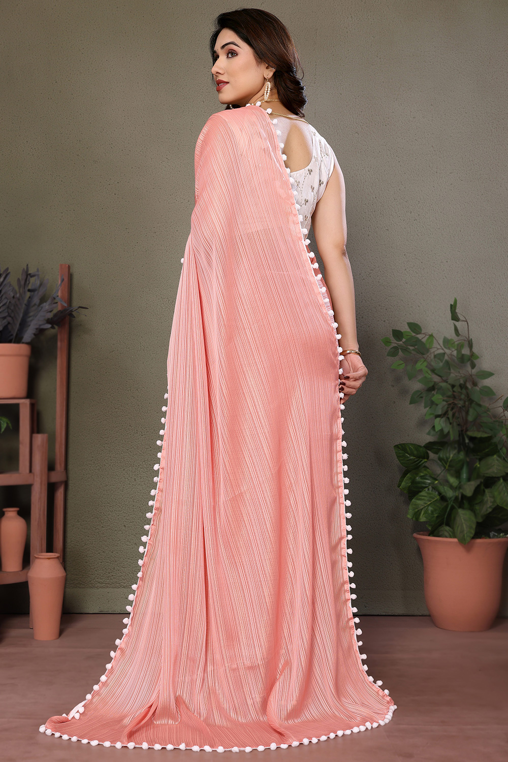 Embrace your love for fashion and inspire the rest with your uber-chic style as you wear this coral pink chiffon saree which will make all the goddesses of love and beauty to write you for your advice.