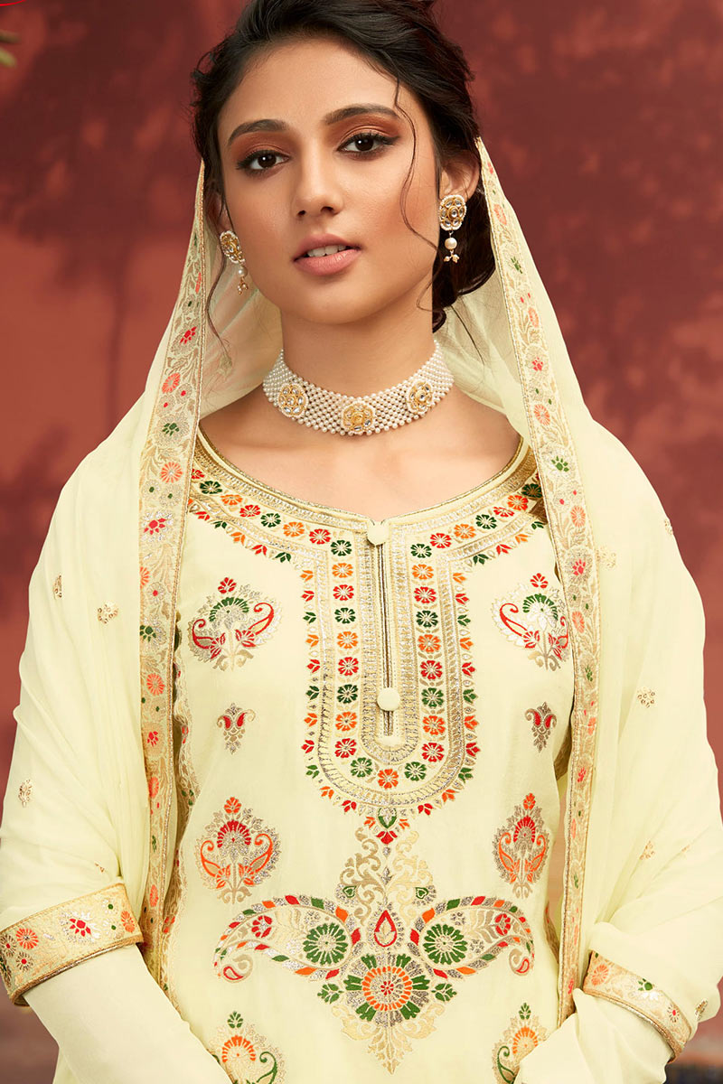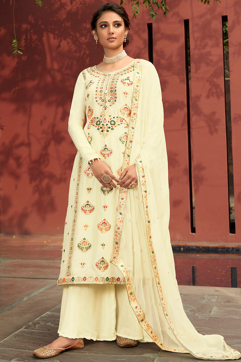 Along with soft silk palazzo pant in cream color with cream chiffon dupatta.