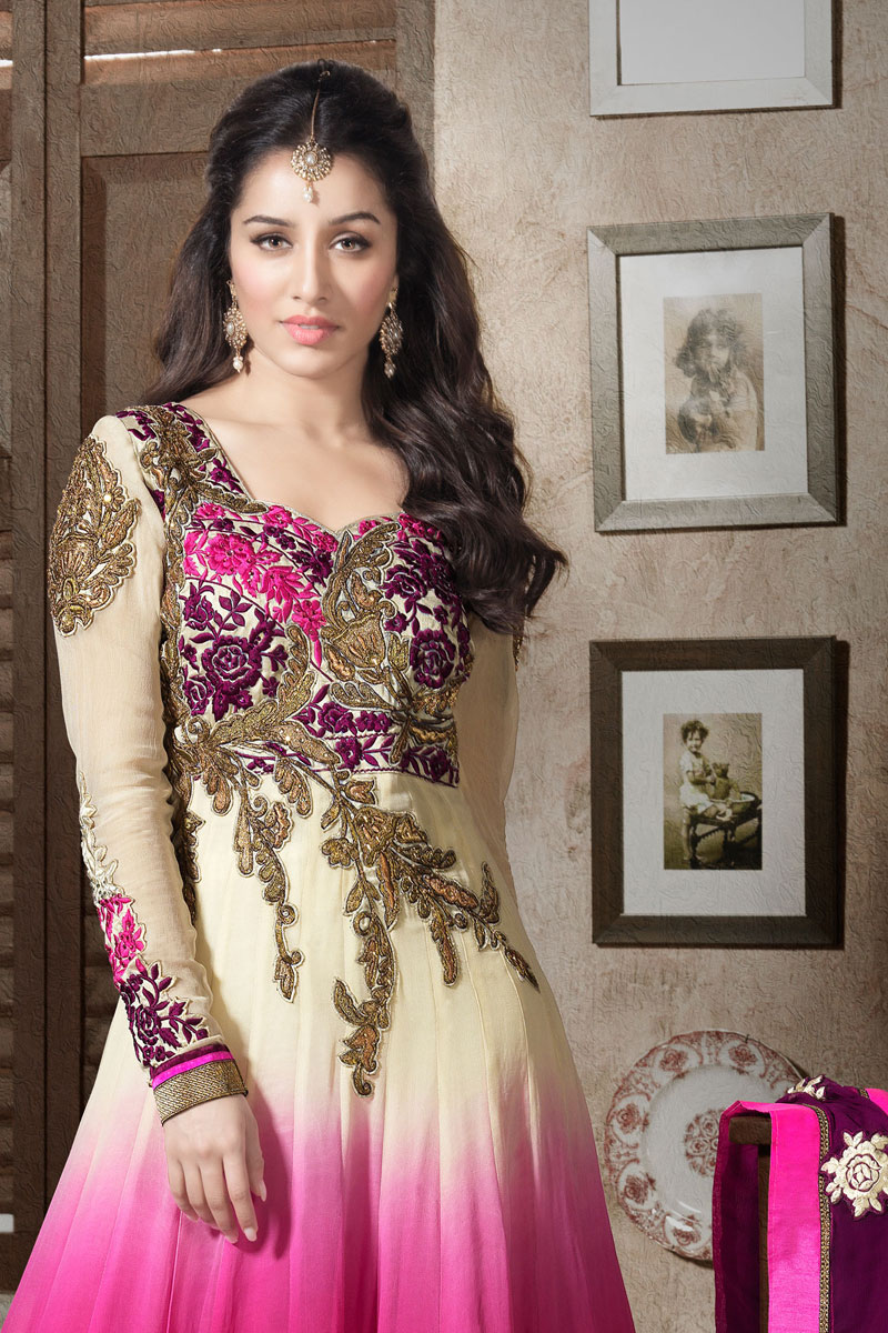 Beautiful Resham and zari embroidery work blends perfectly with enchanting colours. The ultimate Anarkali suit is accompanied with hues of raspberry purple lycra churidar & chiffon dupatta. Style this outfit with a matching clutch and heels.