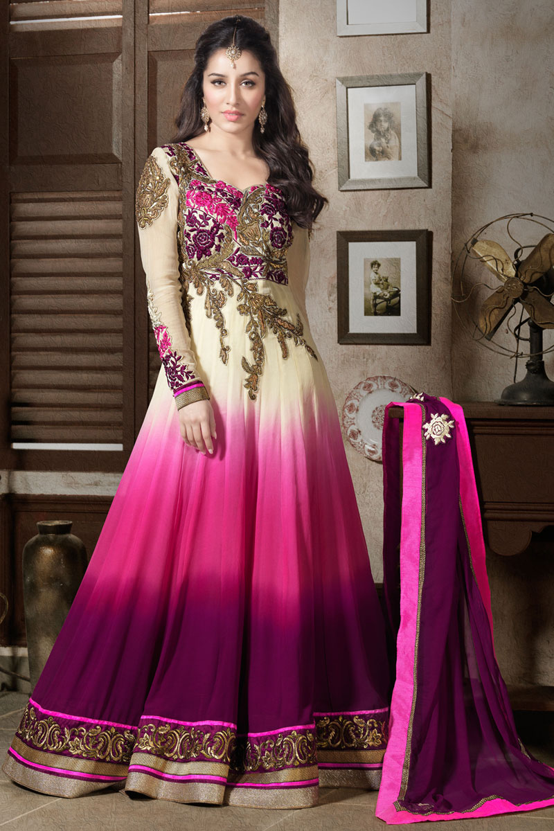 Breeze through the summer with our easy to carry ombre pink and raspberry purple crepe Anarkali suit thats indeed the star of our summer collection. It is not just comfortable but the flirty flare will grab some major attention for sure.