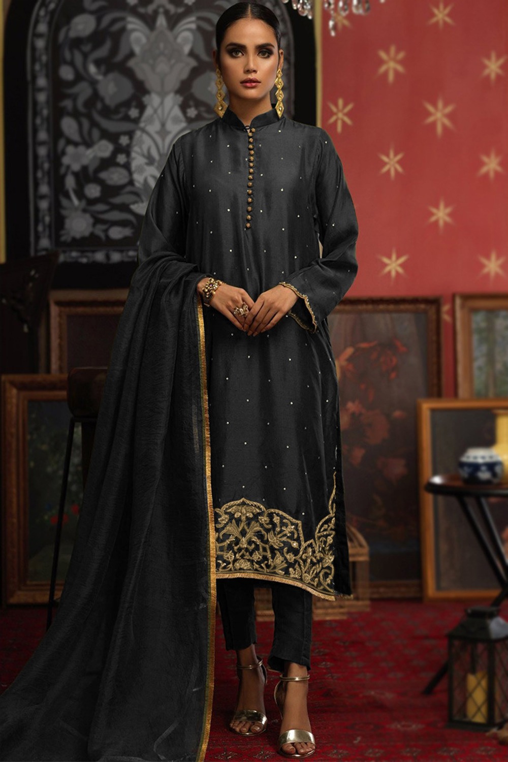 Embrace your love for fashion and inspire the rest with your uber-chic style as you wear this dark grey silk trouser suit which features beautiful embroidery work.