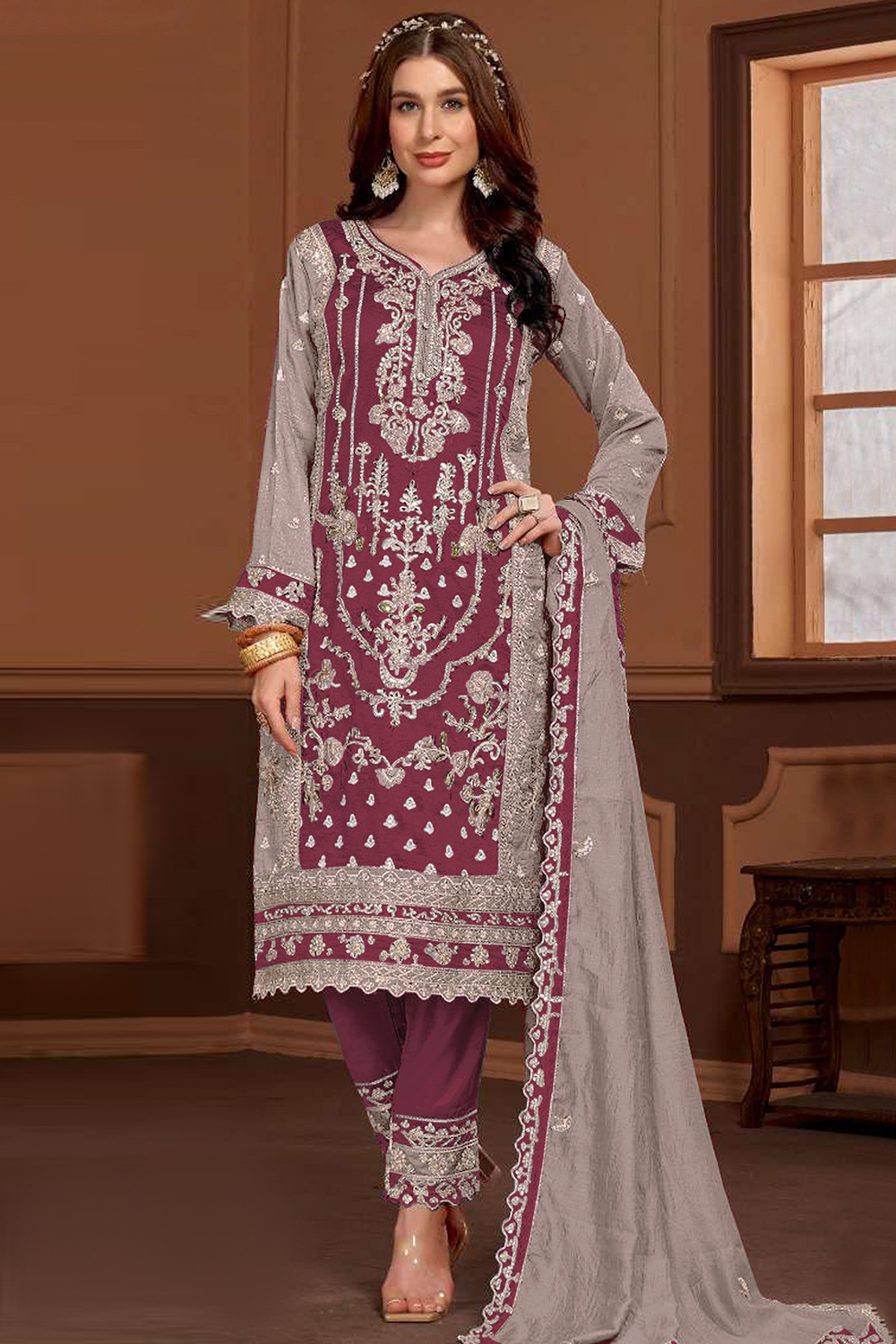Dark Maroon Silk Resham Embroidered Straight Cut Trouser Suit