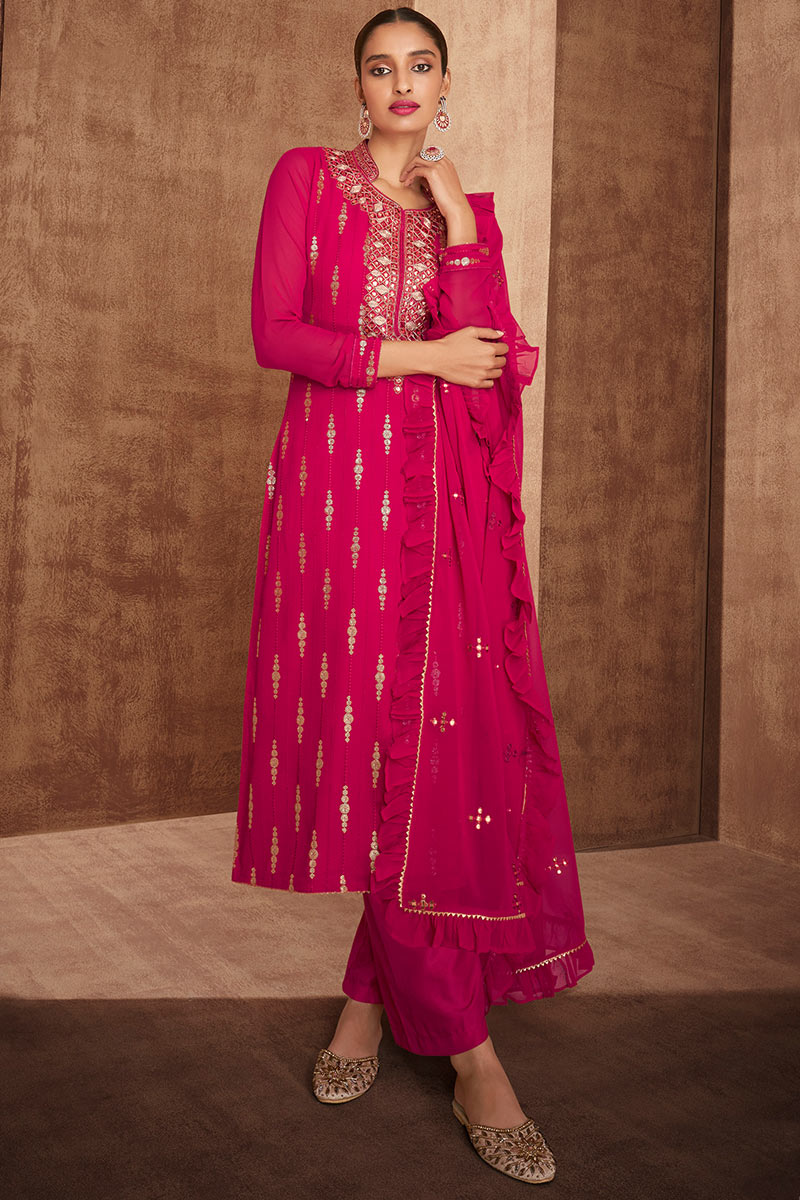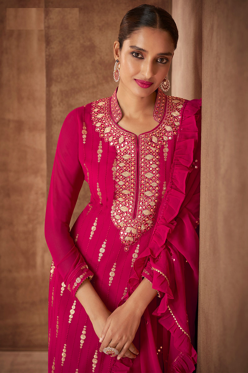 Dazzle everyone around as you walk into a wedding wearing this dark pink Silk trouser suit which features beautiful embroidery work.