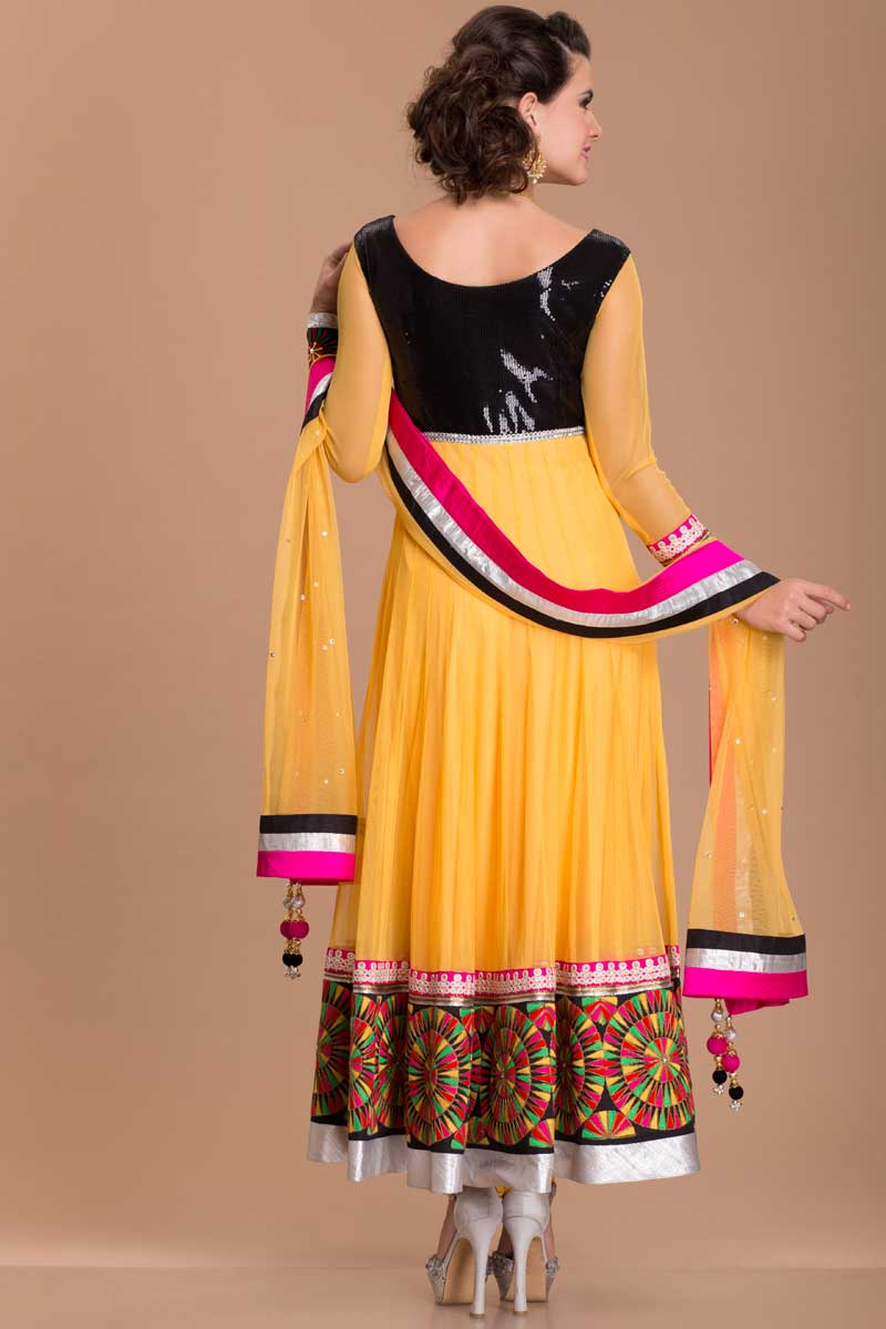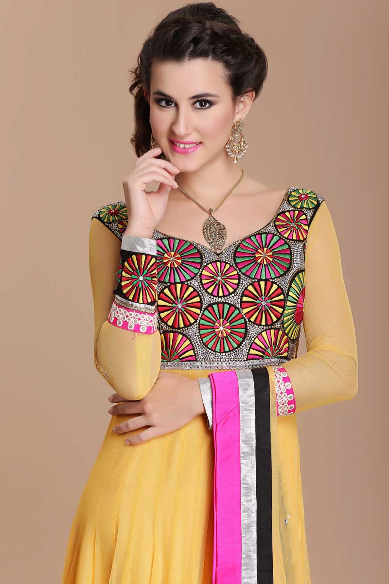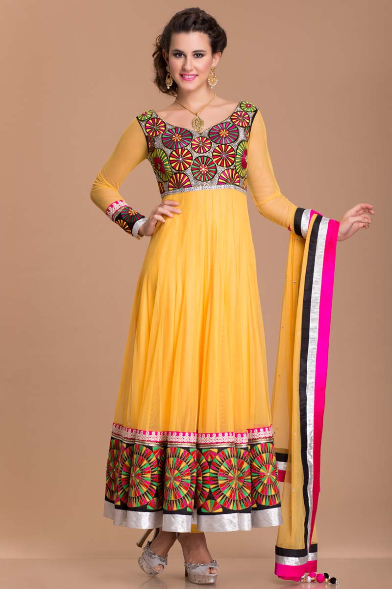 Yellow Net, ready to wear anarkali churidar suit. Yoke and daman/hem embroidered with resham work.