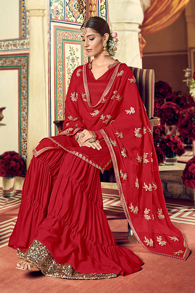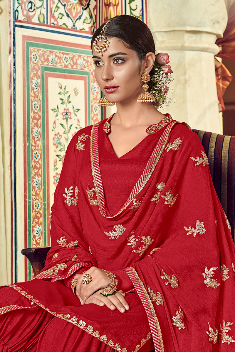 Look elegant when wearing this deep red georgette sharara suit which will make you absolutely classy.