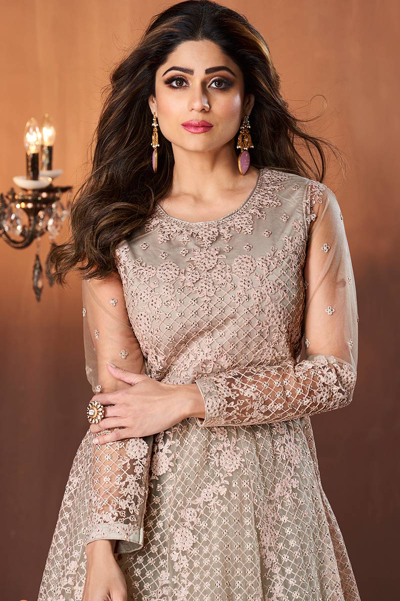 An ideal pick to garner compliments for your gorgeous ethnic look is this grey beige net Anarkali suit which will surely make a standout addition at every party you go.