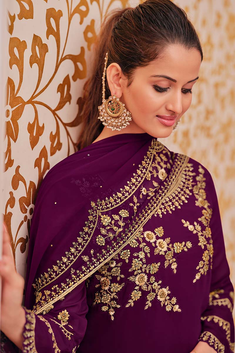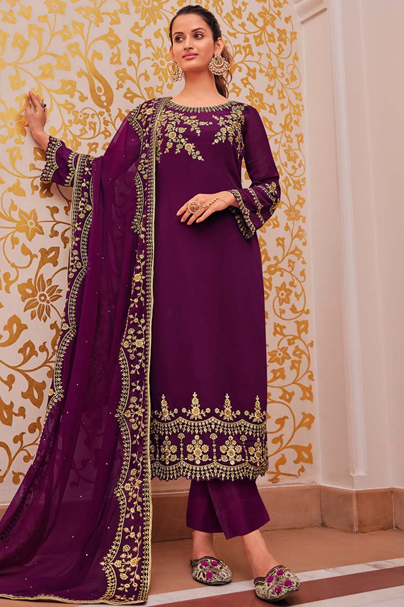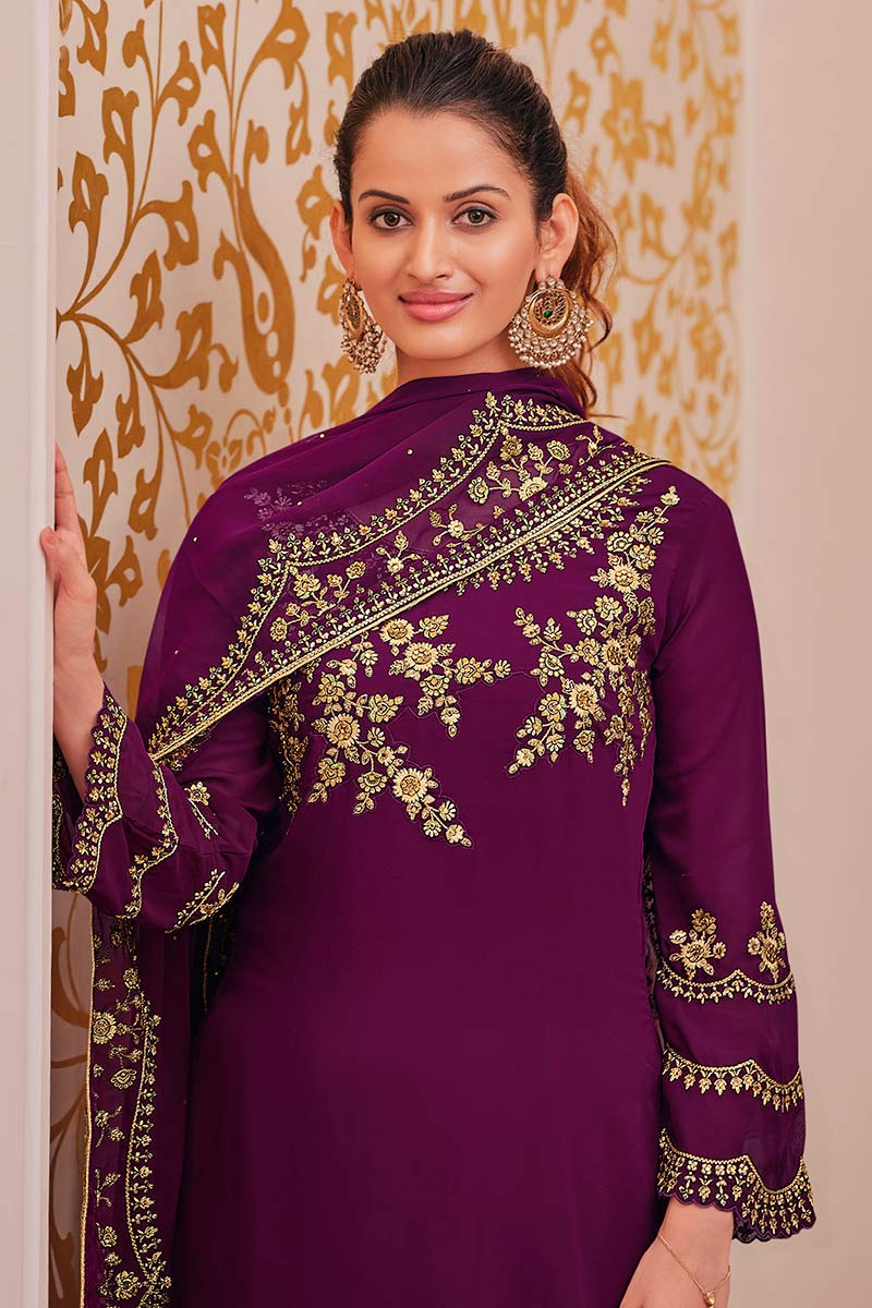 Be the cynosure of all eyes by wearing this magenta pink georgette trouser suit that features beautiful embroidery work.