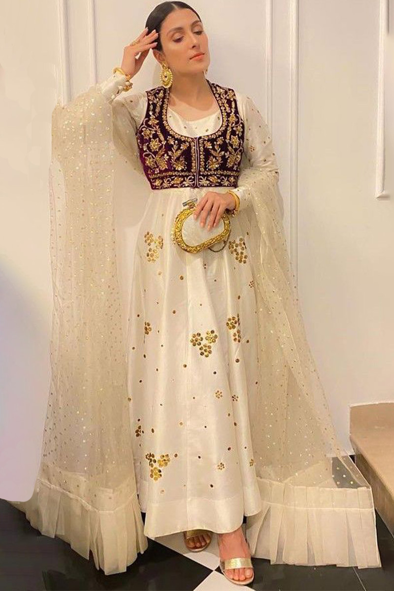 Embroidered Ivory Silk Anarkali Party Wear Salwar Kameez