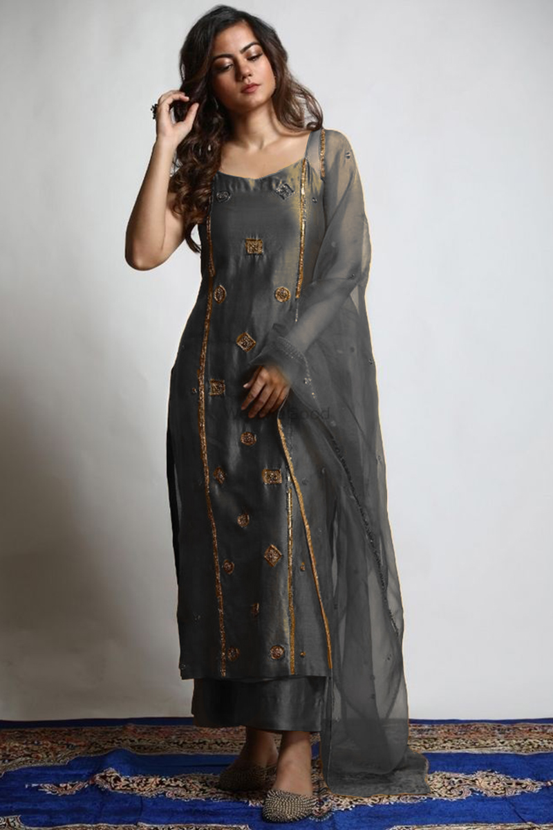 Teamed up with silk straight pant in grey color with grey organza dupatta.