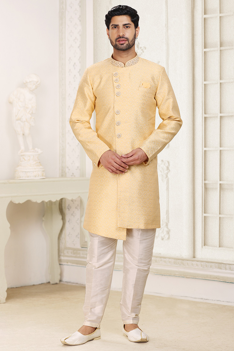 Festival Wear Embroidered Jacquard Pale Yellow Men's Sherwani