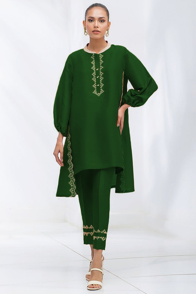 Elegance and charm is what you will exude once you get this green taffeta silk trouser suit which surely deserves a special place in your wardrobe.