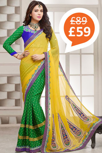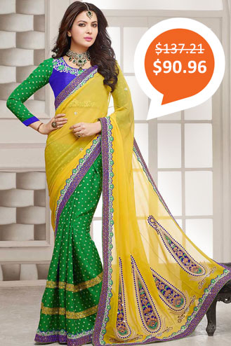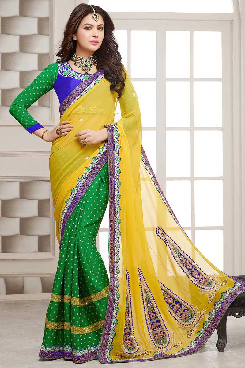 Designer, Traditional Green with Yellow Georgette Saree with Embroidered Border and Embroidered Pallu. Saree Comes with Round Neck Blouse and Quarter Sleeve Blouse and work with Aari, Dori, Kasab, Resham, Zari, Zircon. This design is perfect for Party, Wedding, Festival, Ceremonial and Occasion Wear. .(Slight variation in color and patch border is possible).Free Services: Fall and Edging