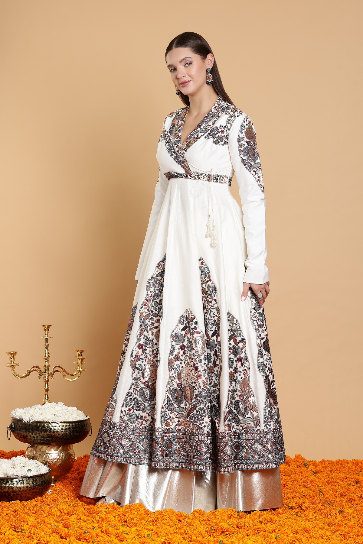 This floor-length Anarkali in luxurious chanderi silk features a classic A-line angrakha style with a flattering V-neckline and full sleeves, blending elegance with comfort.