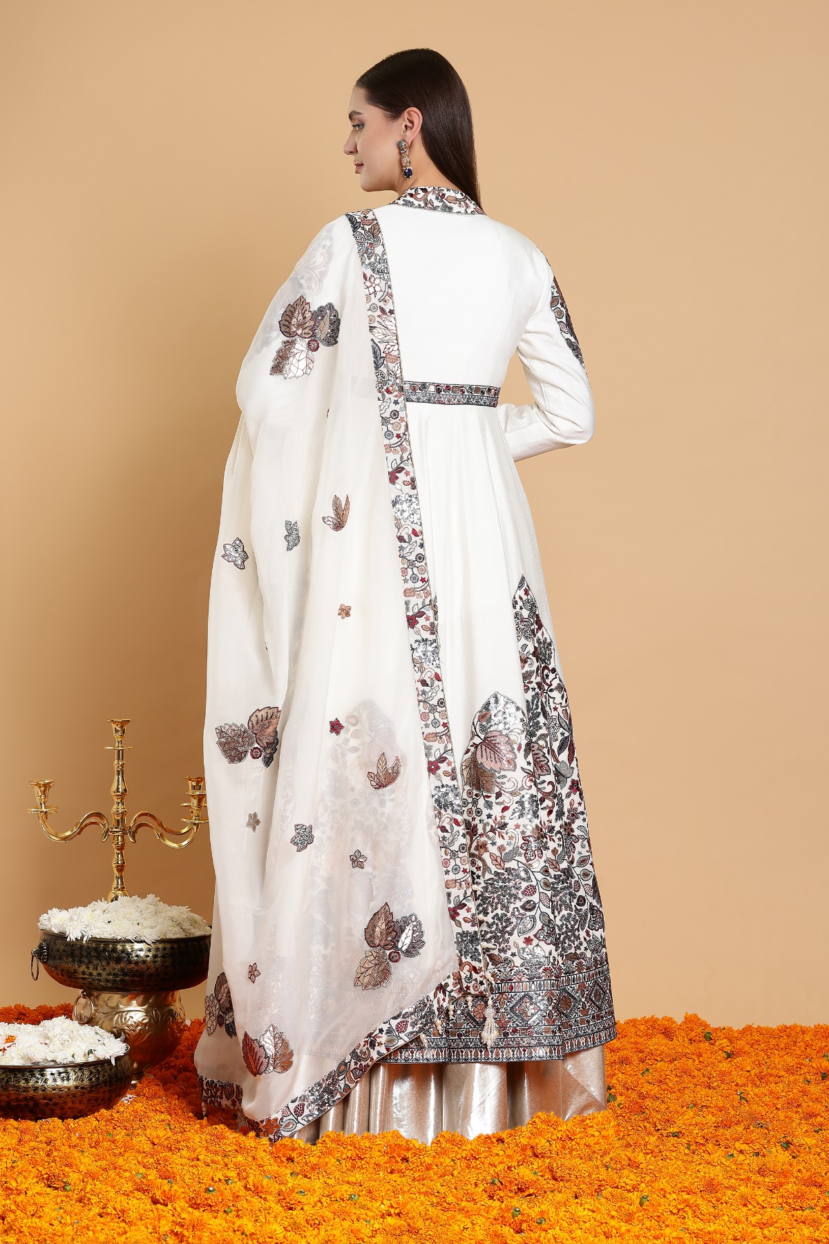 Customizable up to 69 Andaaz Size, this embroidered Diwali outfit ensures an elegant and comfortable fit for all body types.
