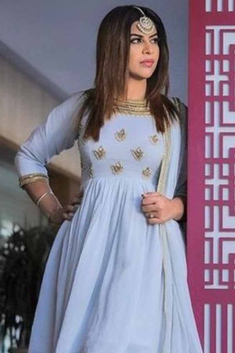 Teamed up with georgette sharara pants in Powder Blue color with Powder Blue georgette dupatta.
