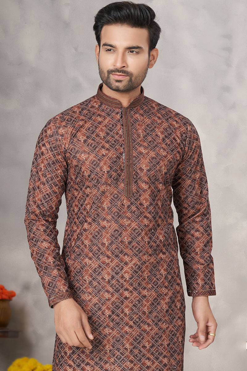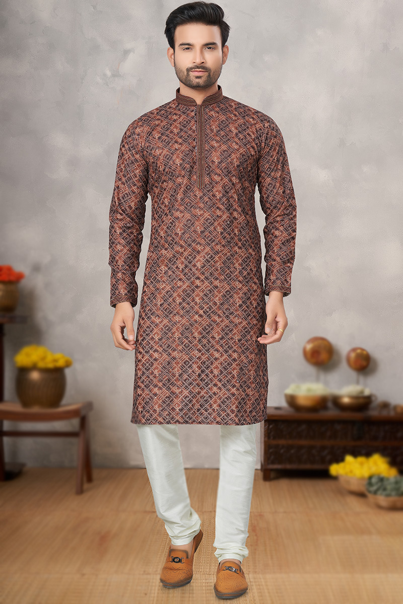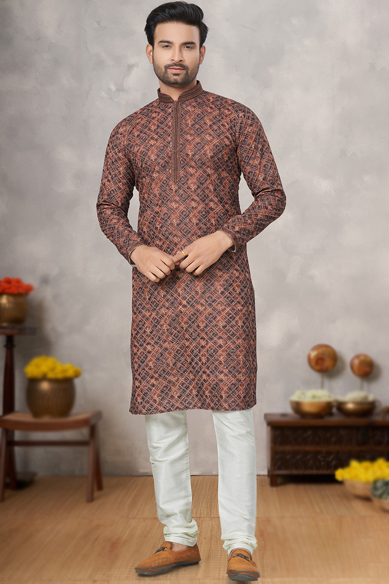 Look your best at any festive occasion with this stunning light brown men's kurta with churidar. Made from cotton fabric, it features exquisite resham thread and bandhej print work that adds to its traditional appeal. The Chinese collar and full sleeves offer a stylish touch, while the bottom made of dupion silk fabric completes the look. Designed to fit a wide range of body types, this kurta with churidar can be customized up to a maximum size of 44 inches.