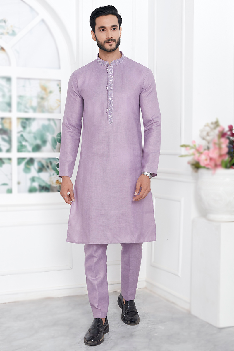 Light Purple Cotton Embroidered Men's Straight Cut Kurta Pajama