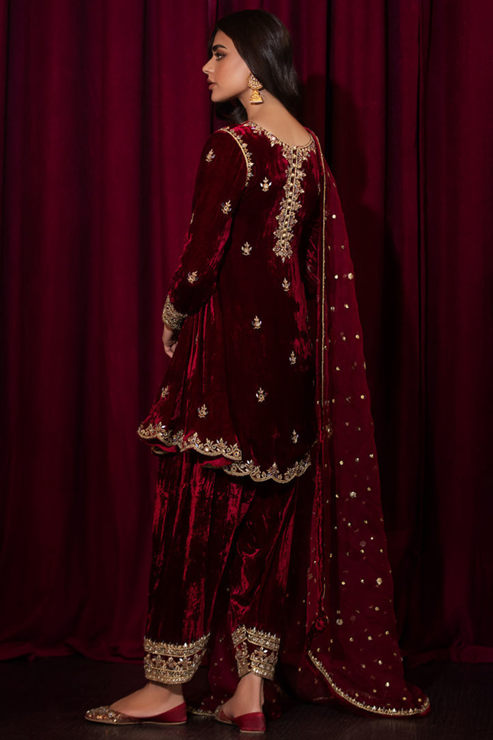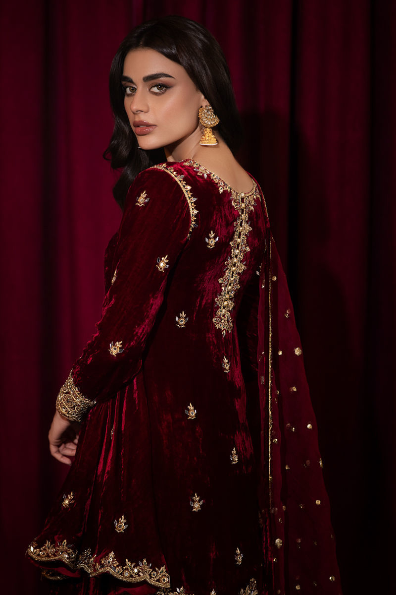 Maroon Velvet Embroidered Frock Style Salwar Suit