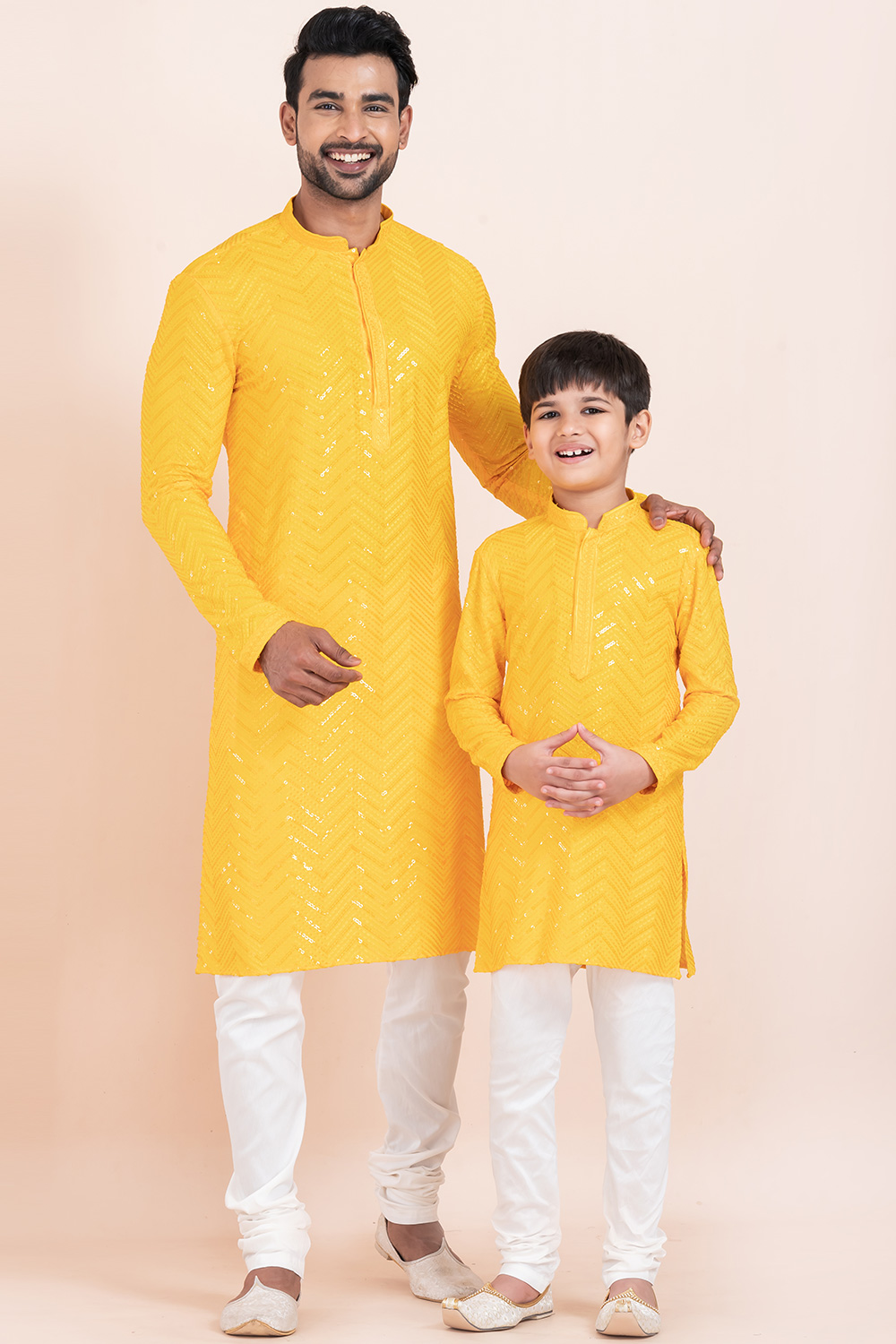 Mustard Yellow Rayon Embroidered Father Son Duo Kurta With Churidar
