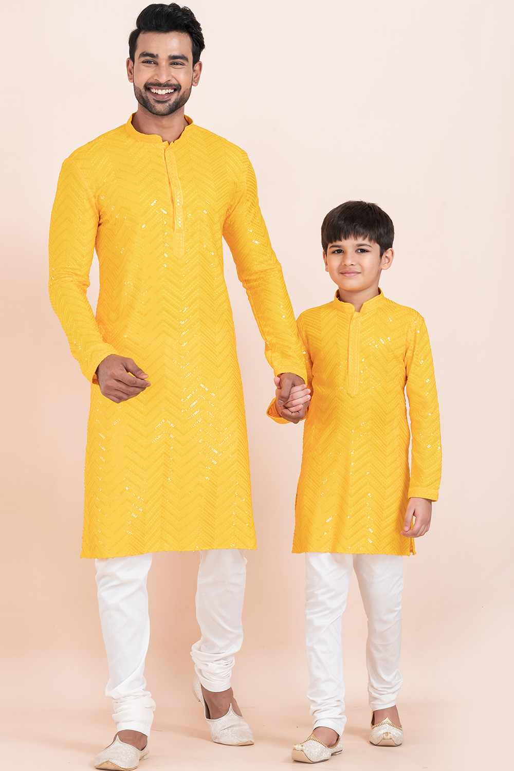 Elevate your style for any festive gathering with this striking mustard yellow father-son duo kurta churidar. Crafted from luxurious rayon fabric, it boasts a beautiful resham thread and sequins work that enhances its timeless charm. The Chinese collar and full sleeves offer a stylish touch, while the bottom is made of silk blend fabric, completing the look. This kurta with churidar can be customized up to the maximum size available in inches, 52 for the father and up to 14 years for the son.