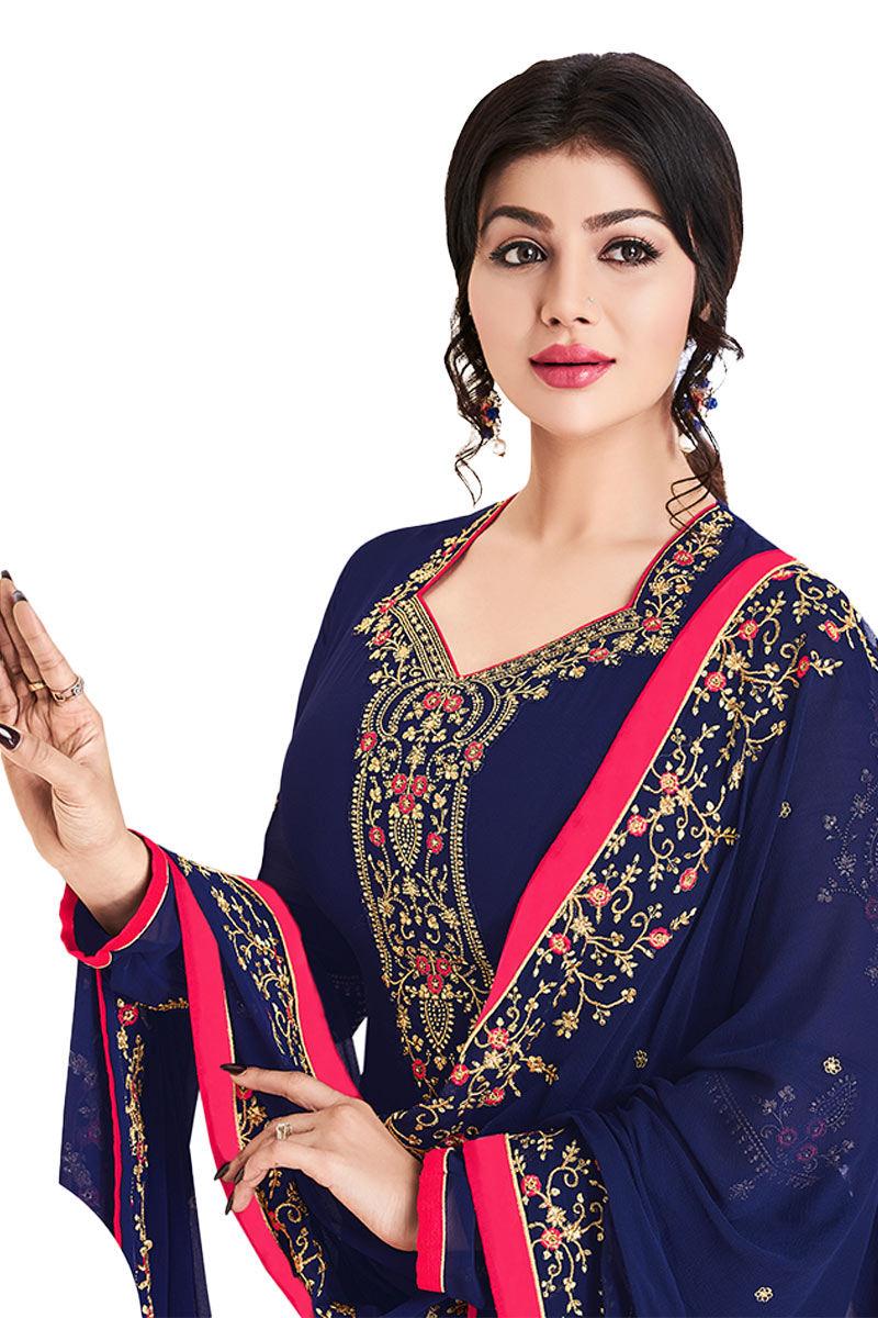 Dazzle everyone around as you walk into a wedding wearing this navy blue georgette churidar suit which will make you ready to make a statement in the upcoming occassion.