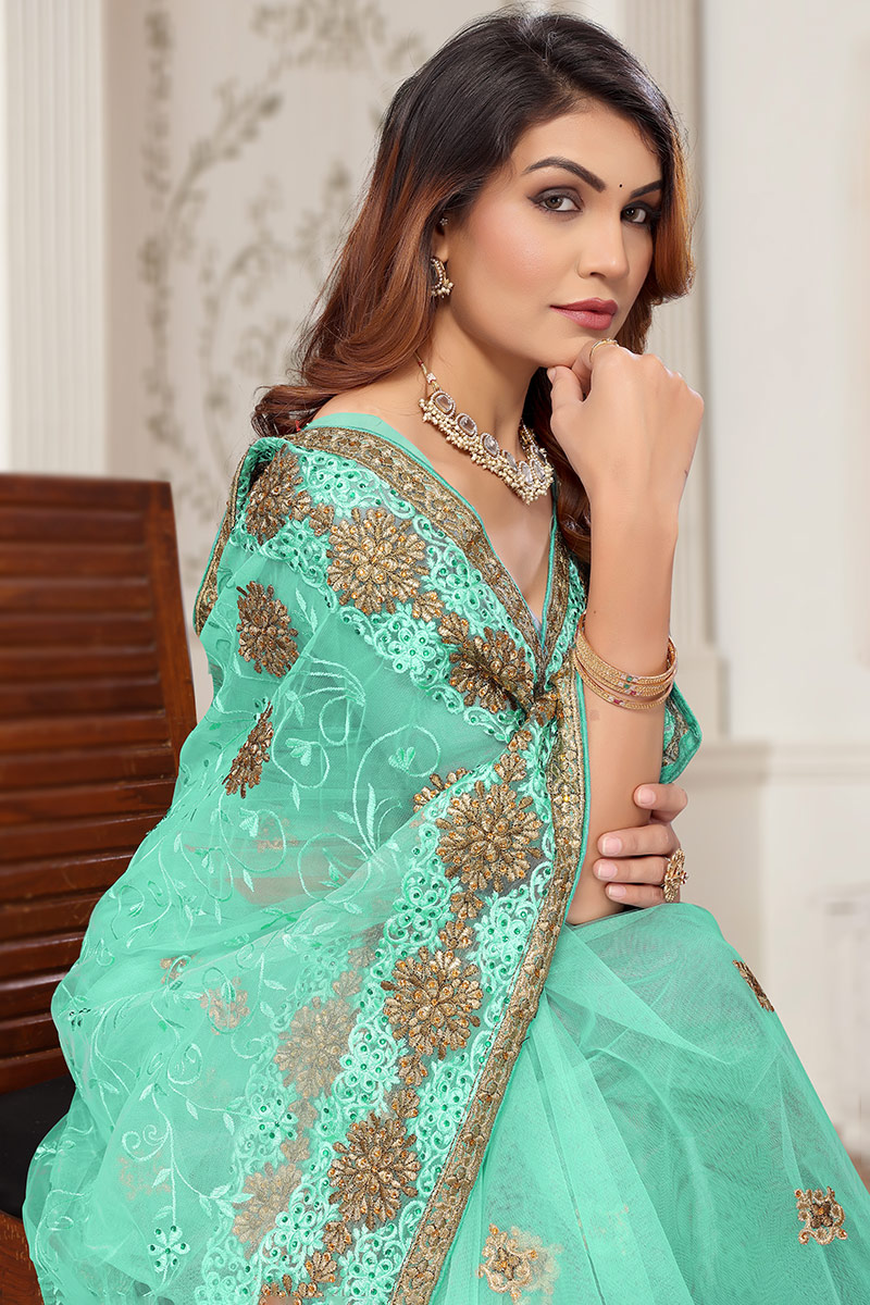 This seafoam green net saree which will provide you with unmatched all-day comfort.