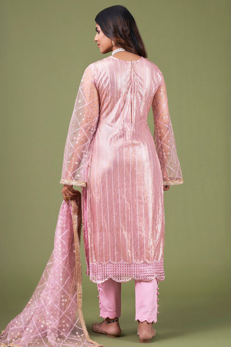 Look fabulous and beautiful by wearing this pastel pink net trouser suit which will surely make a statement..