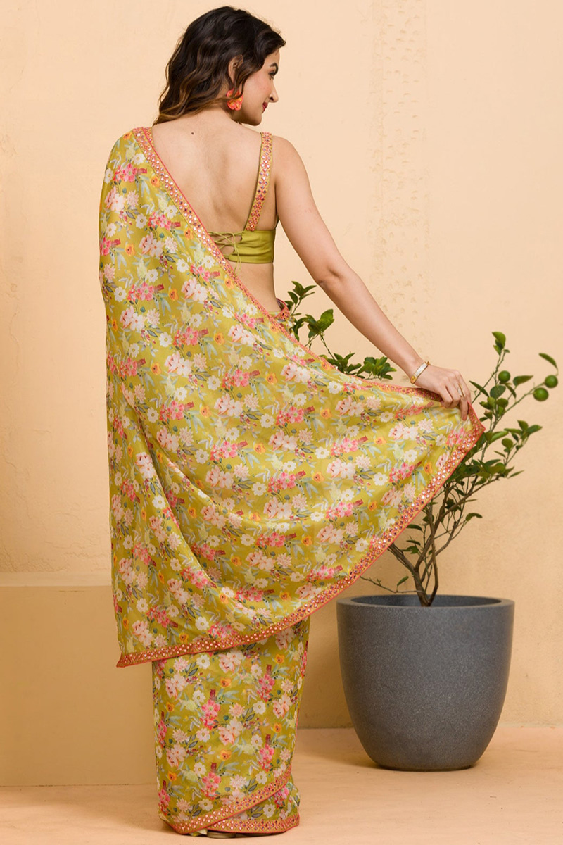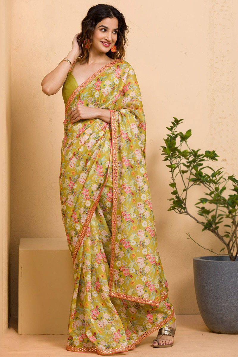 It is paired with a crepe floral saree in pear green color designed using floral print and lace work.