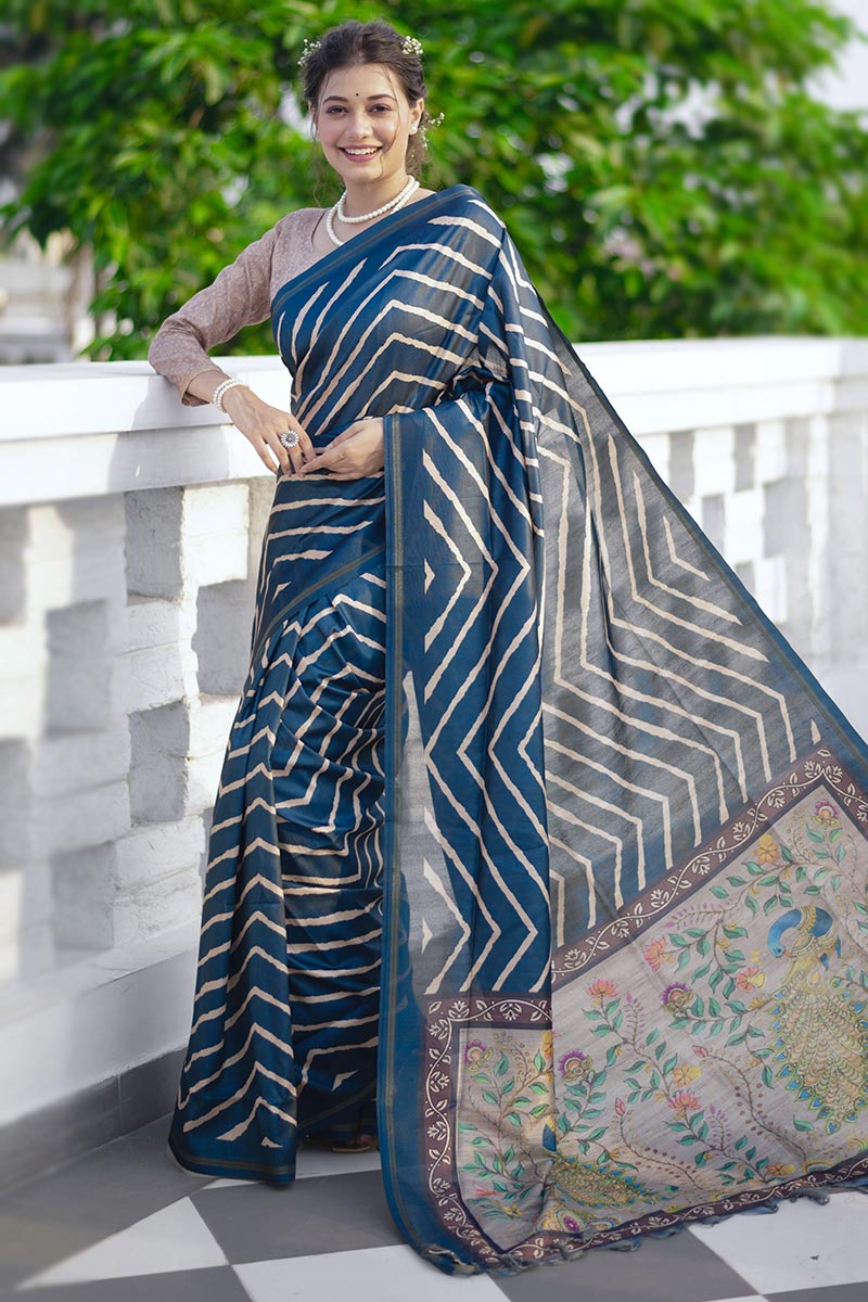 Printed Tussar Silk Blue Saree