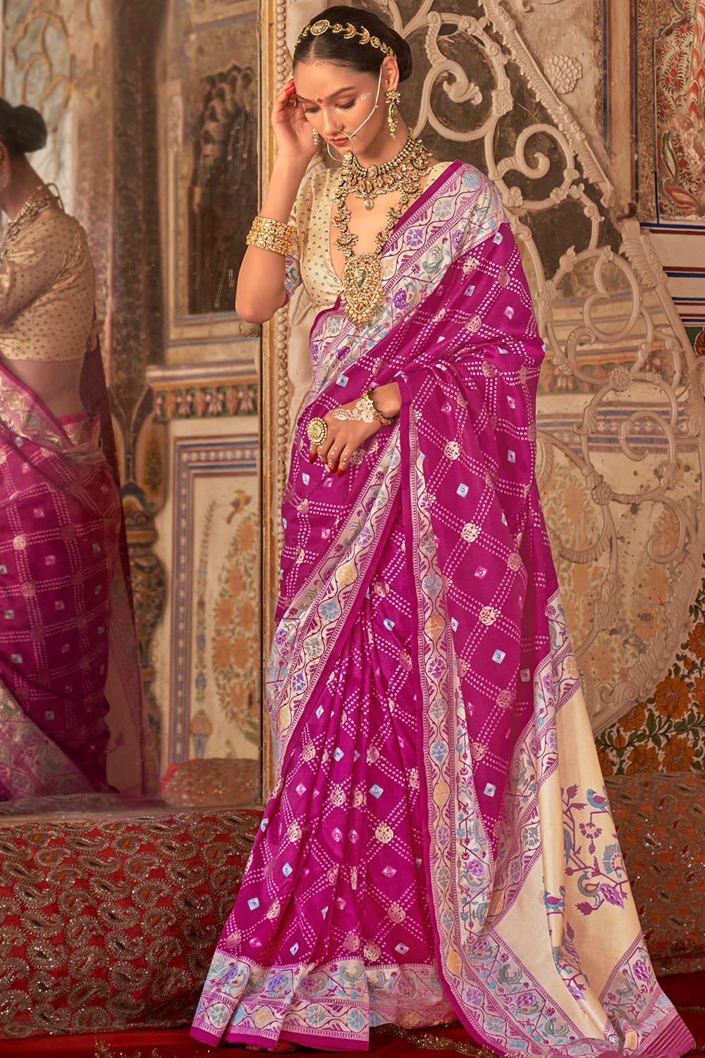 It is teamed up with a silk blend paithani saree in rani pink color, designed using printed, weaved with thread and zari work.