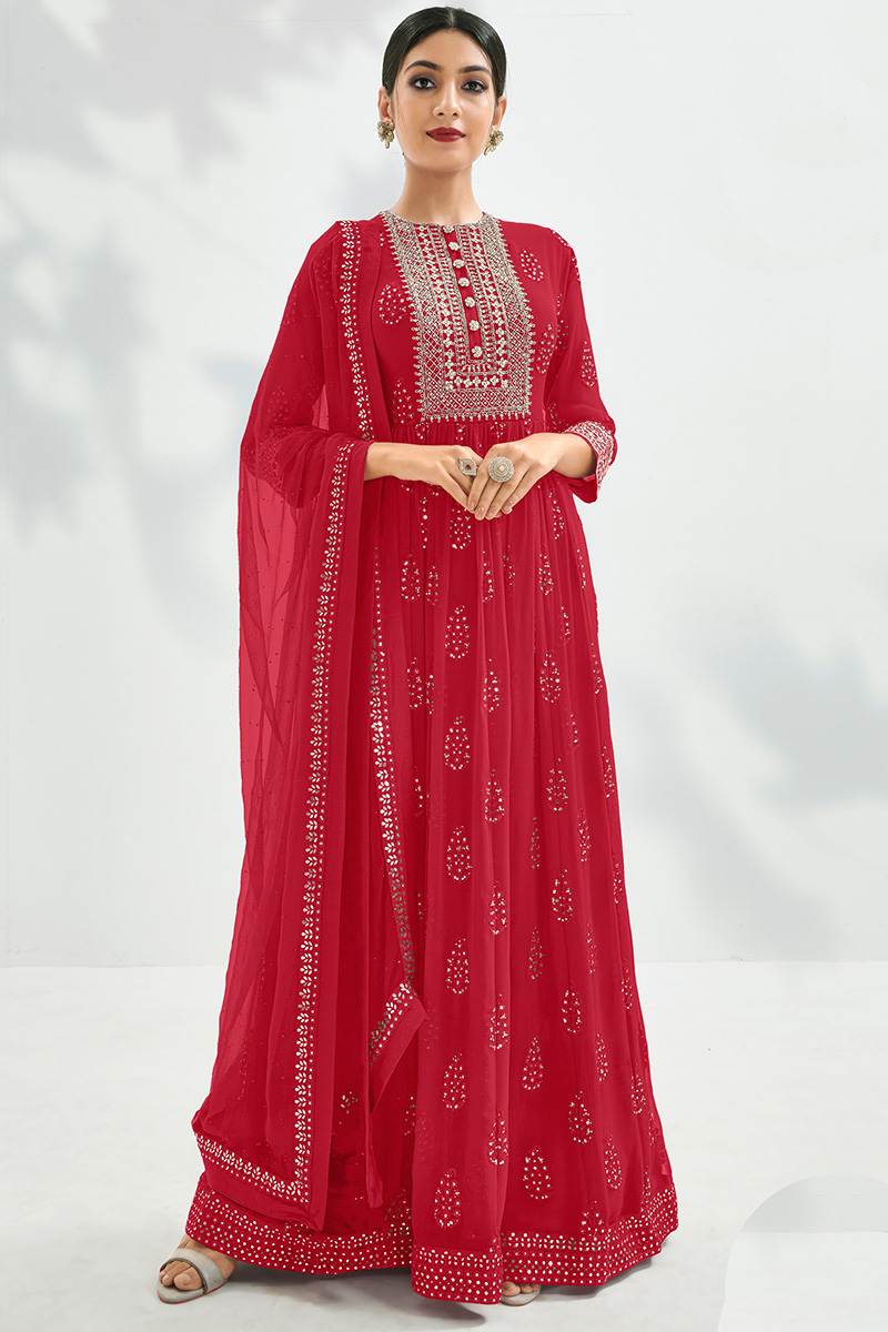Elegance and charm is what you will exude once you get this red georgette anarkali suit which will make your look very subtle yet edgy.