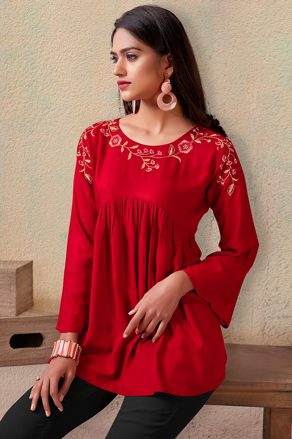 Enhance your ethnic charm by wearing this red rayon kurti is which features beautiful. This round neck and 3/4 kurti is designed using resham thread work. This kurti can be customized up to the maximum size available in inches, 46.