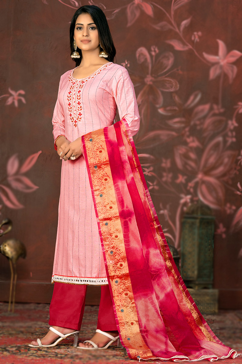 Gorgeously mesmerizing is what you will look at the next social function by wearing this light pink cotton straight cut suit which features beautiful embroidery work.
