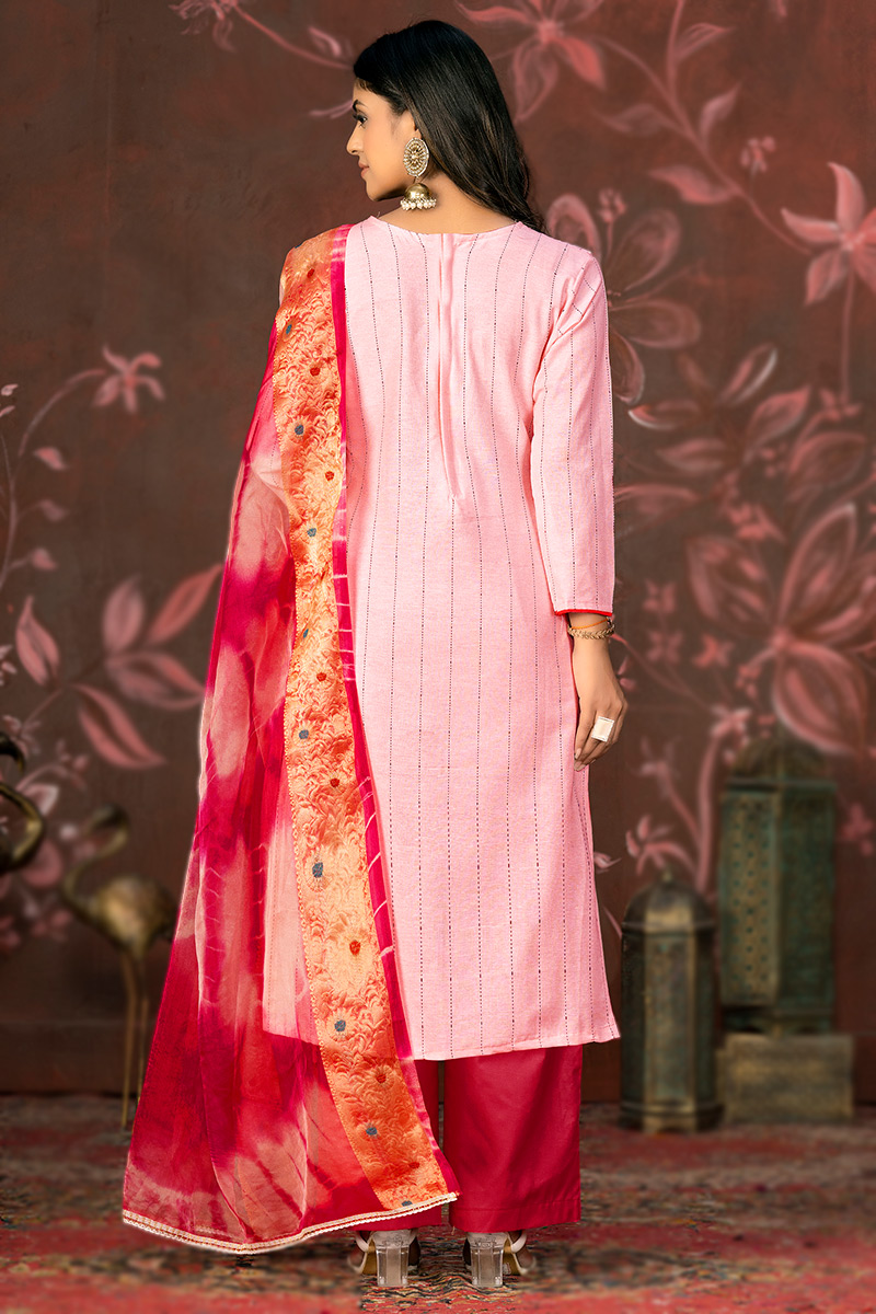 Resham Embroidered Light Pink Cotton Straight Cut Salwar Kameez