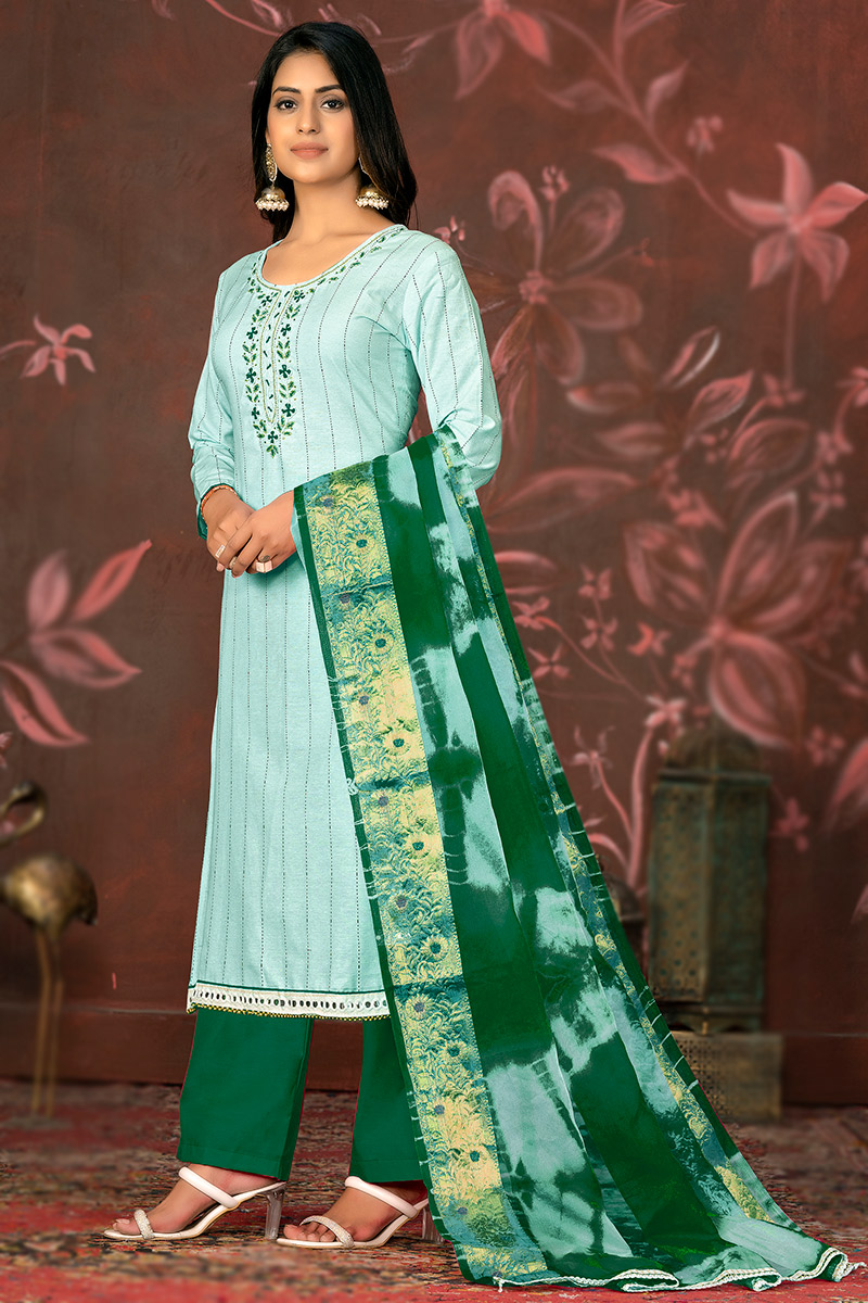 Featuring beautiful embroidery, this mint blue cotton straight cut will be scene-stealing ethnic wear to shine in the spotlight.