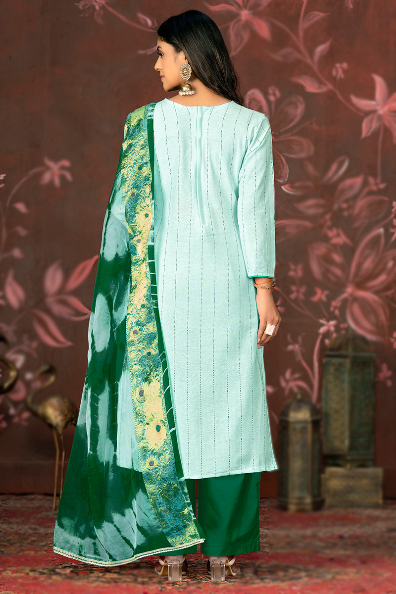 Mint Blue Cotton Resham Embroidered Straight Cut Salwar Suit
