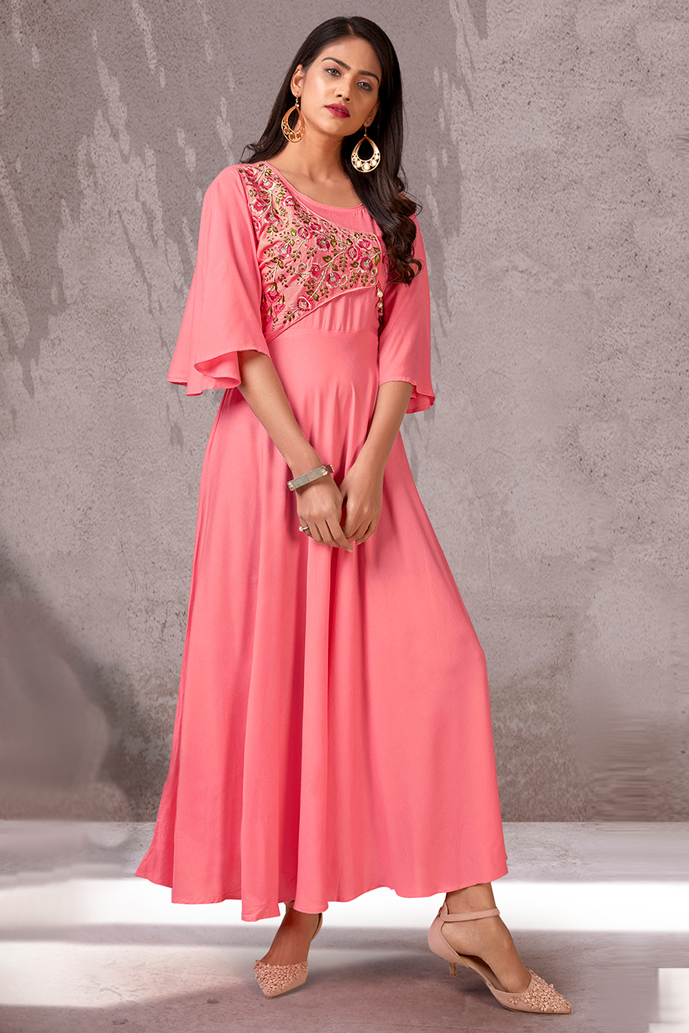 Let the next ethnic occasion see you flaunt a mesmerizingly vibrant avatar wearing this salmon pink kurti in rayon fabric, which will be scene-stealing ethnic wear to shine in the spotlight. This round neck and 3/4th sleeve kurti is elaborated using beautiful resham thread and zari work.
