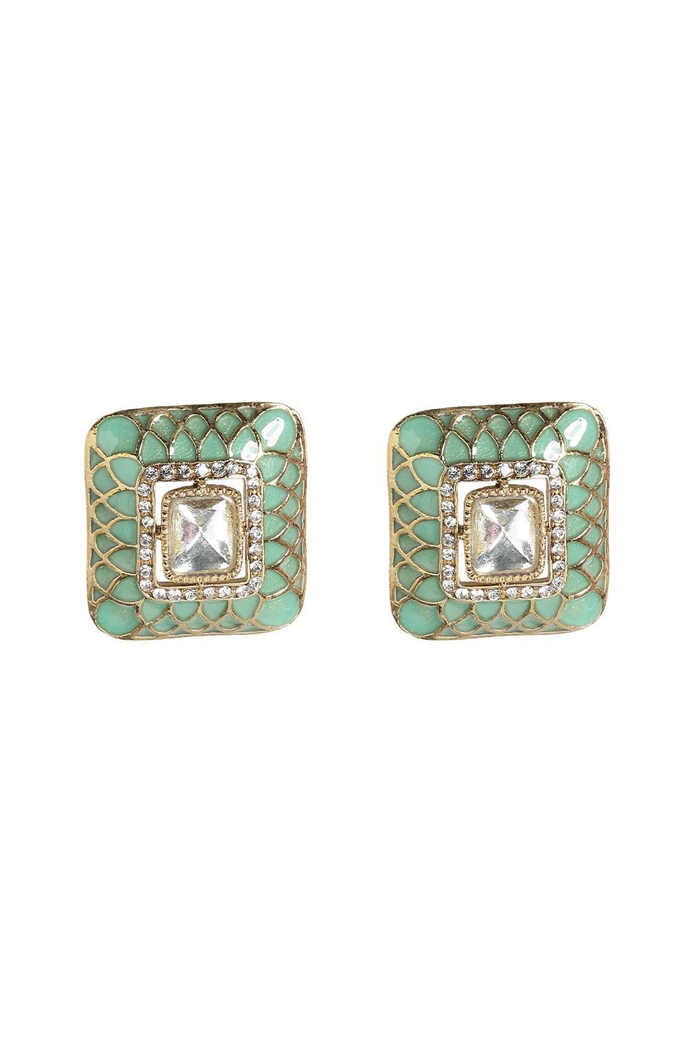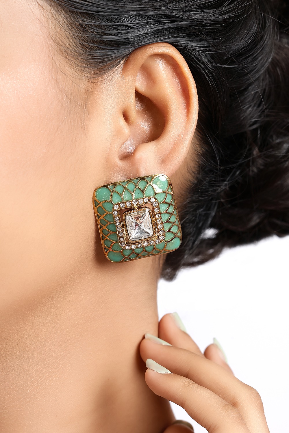 Cast a captivating spell with these sea green brass earrings, where vibrant Meena artistry, radiant gold-plated work, and sparkling stones come together to create a statement piece that speaks volumes without saying a word.