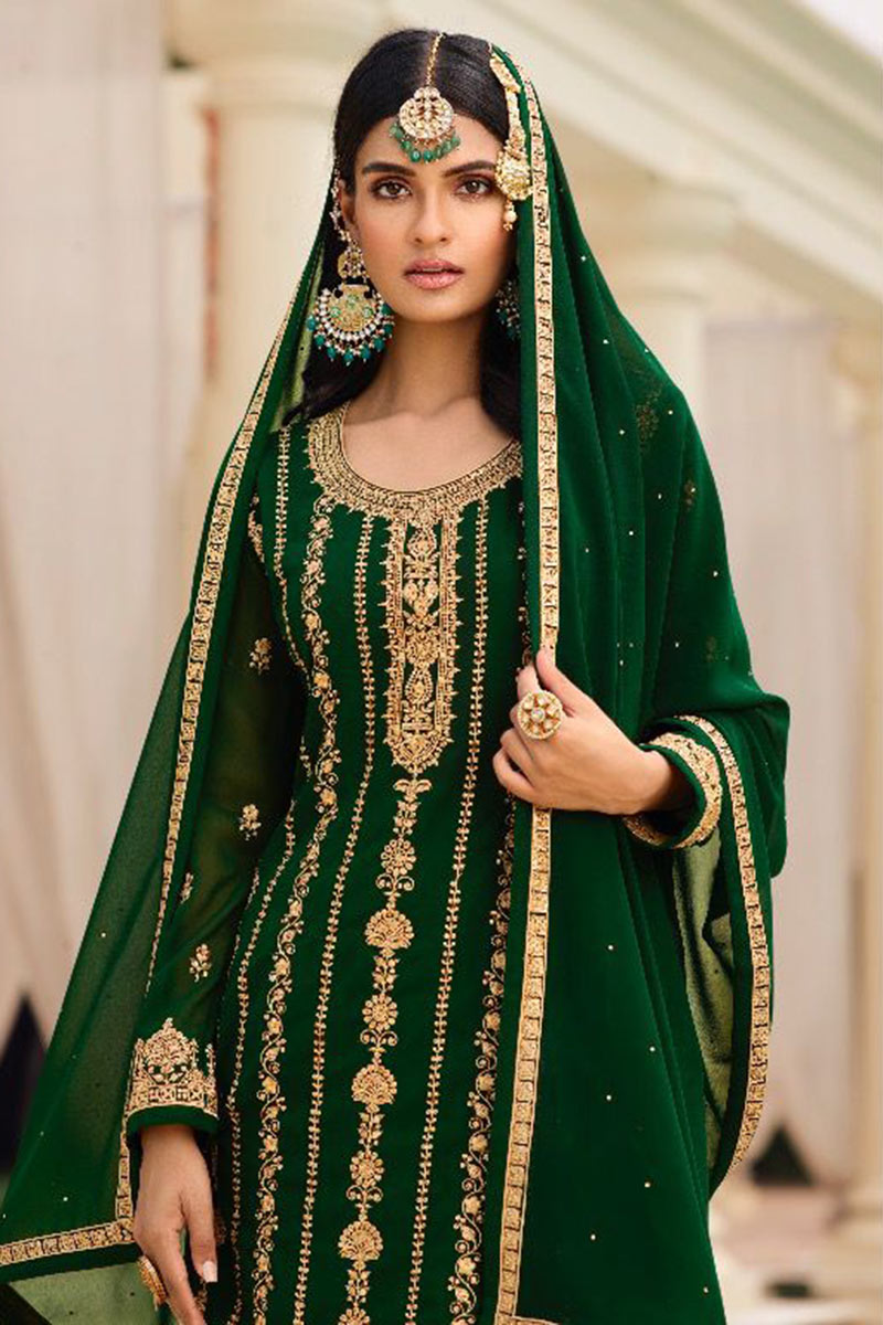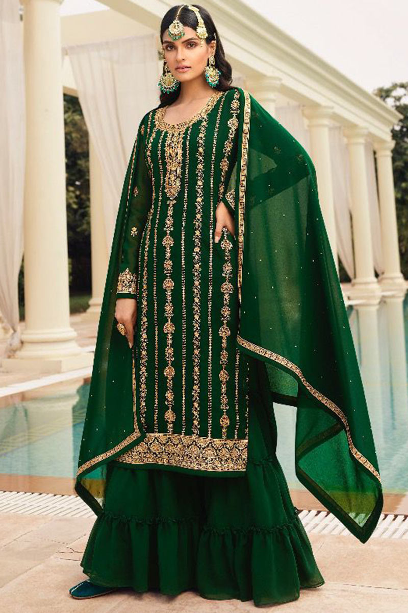 Sequins Embroidered Georgette Dark Green Wedding Sharara Salwar Kameez