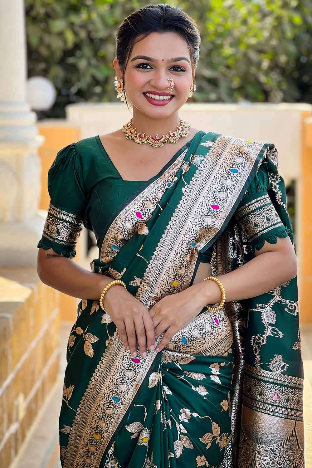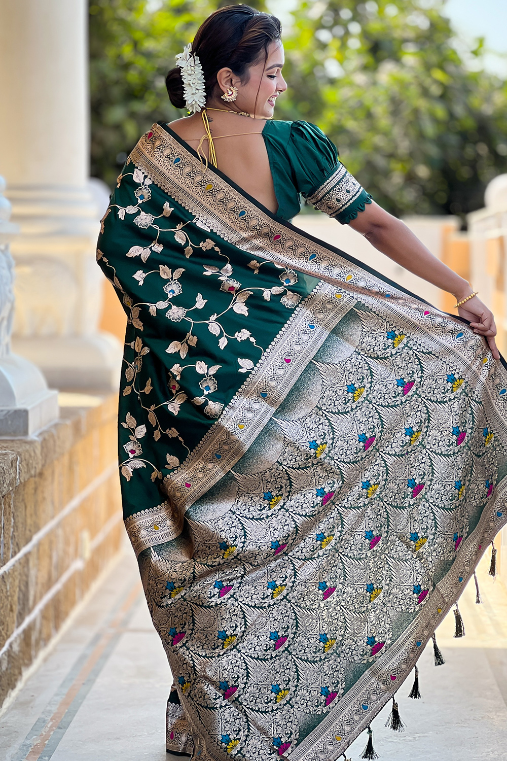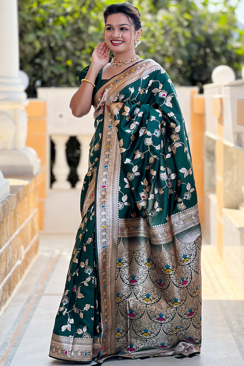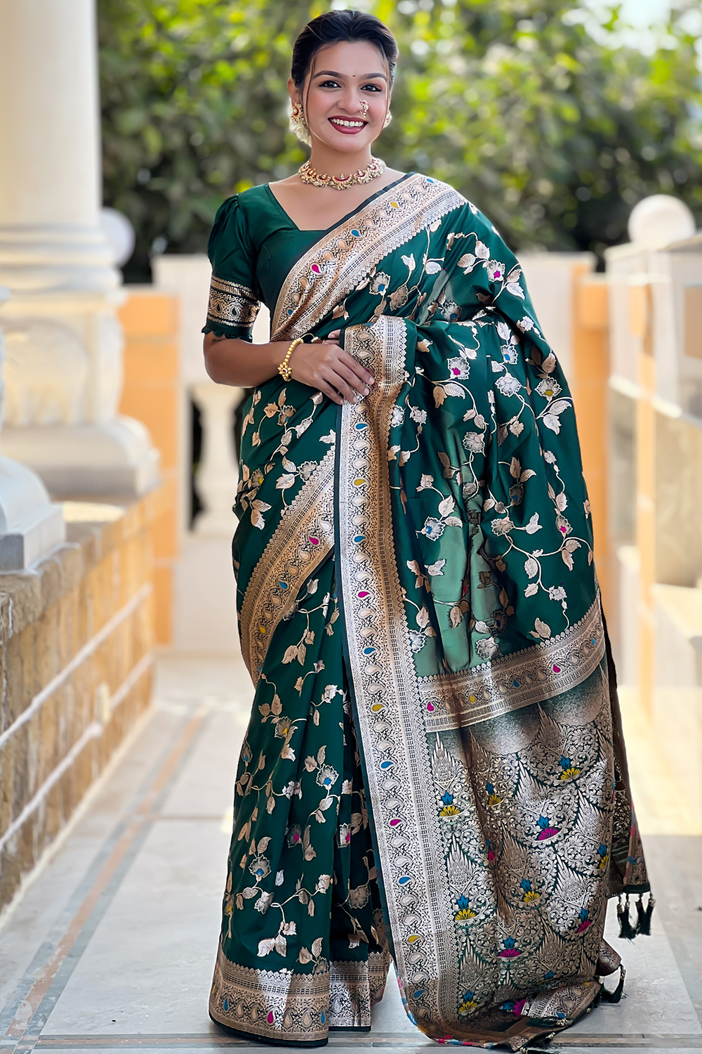 Let the next ethnic occasion see you flaunt a mesmerisingly vibrant avatar wearing this bottle green silk blend saree, which will make all the goddesses of love and beauty write to you for your advice.