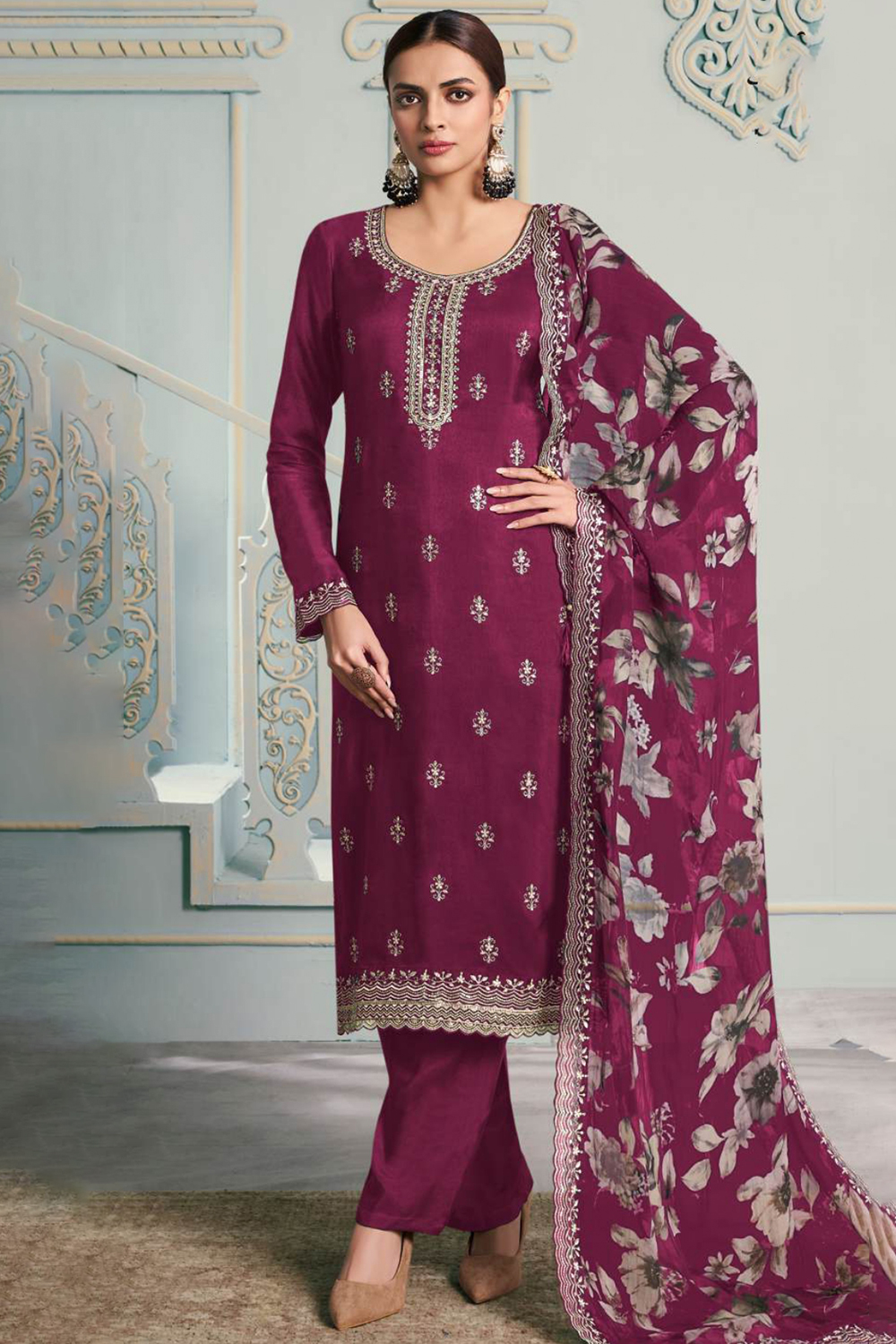 Set together with santoon straight pants in wine maroon color with wine maroon organza dupatta.