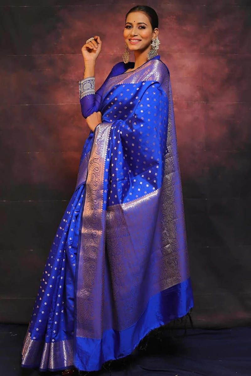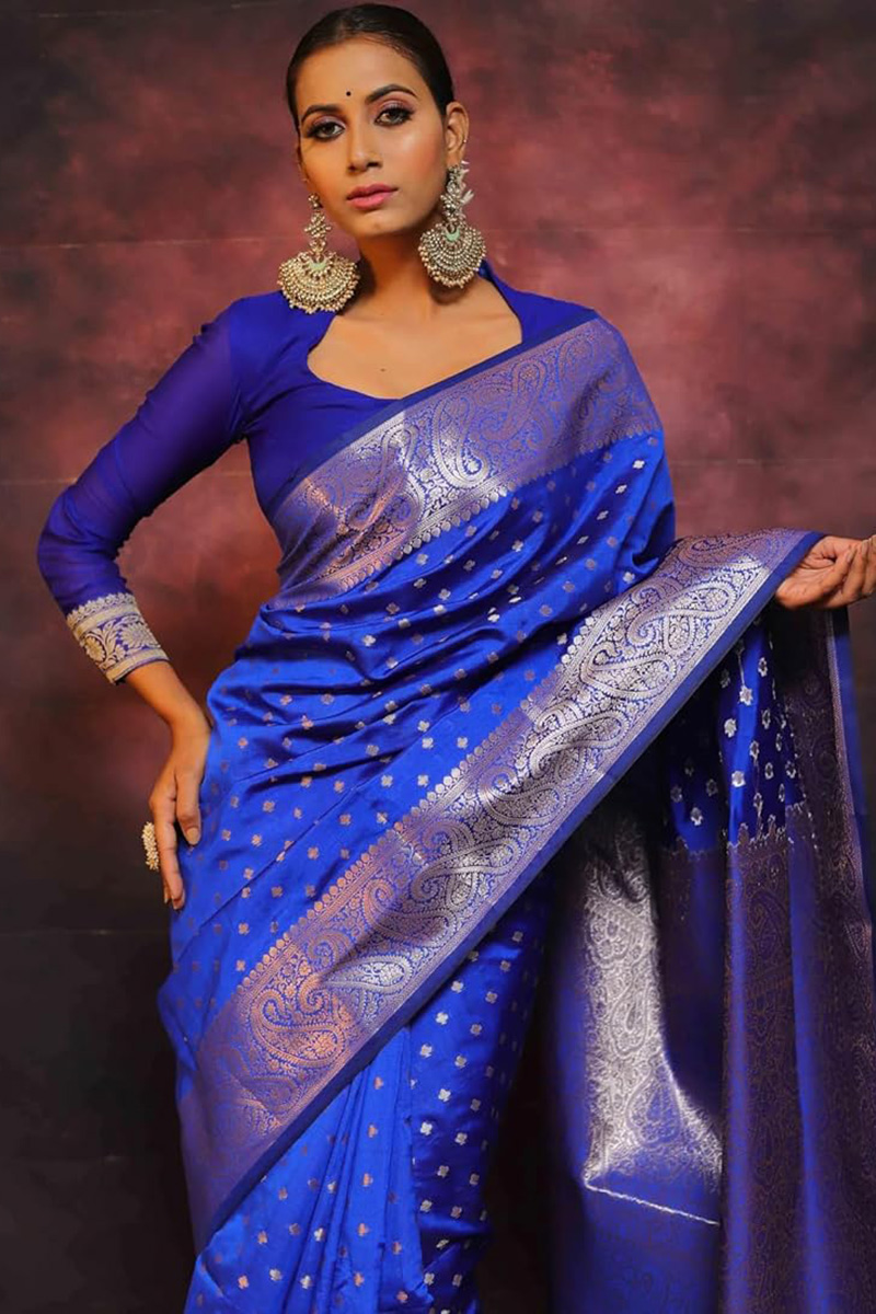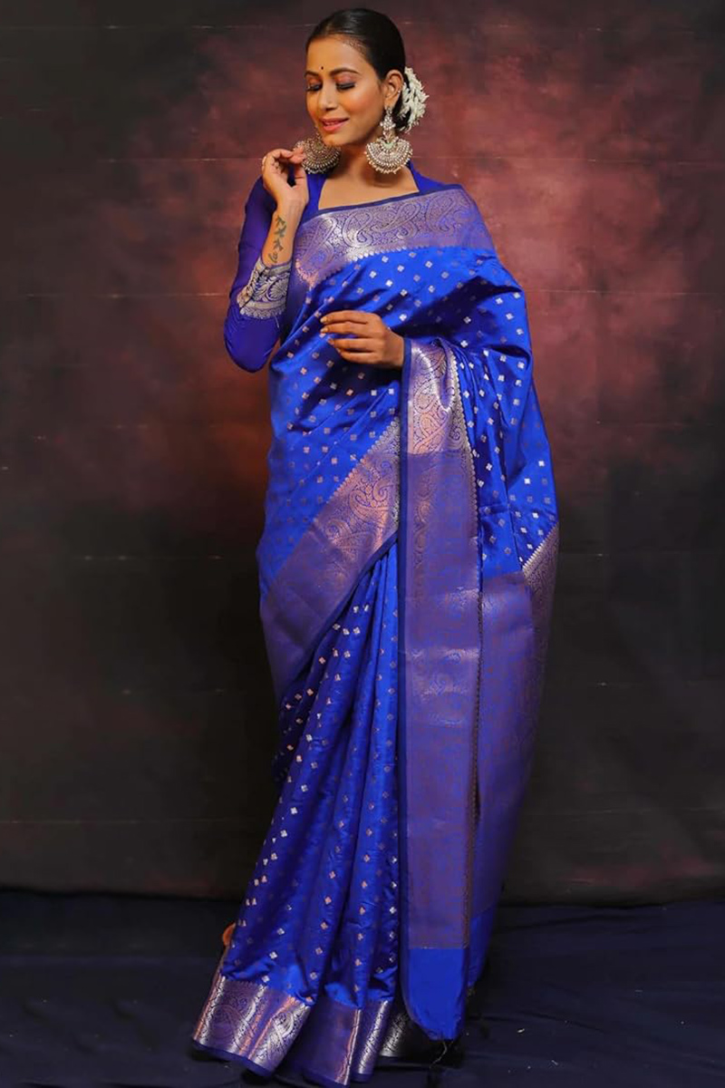 Bright and colorful, this royal blue silk saree will lure the audience like never before.