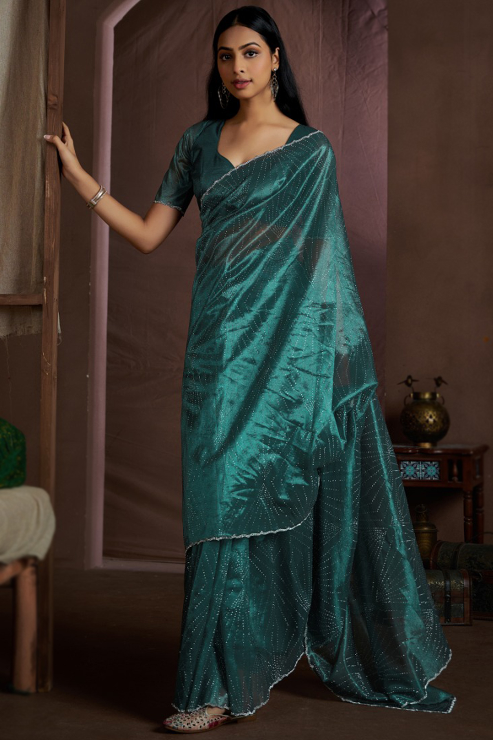Teal Green Organza Stone Embellished Light Weight Saree