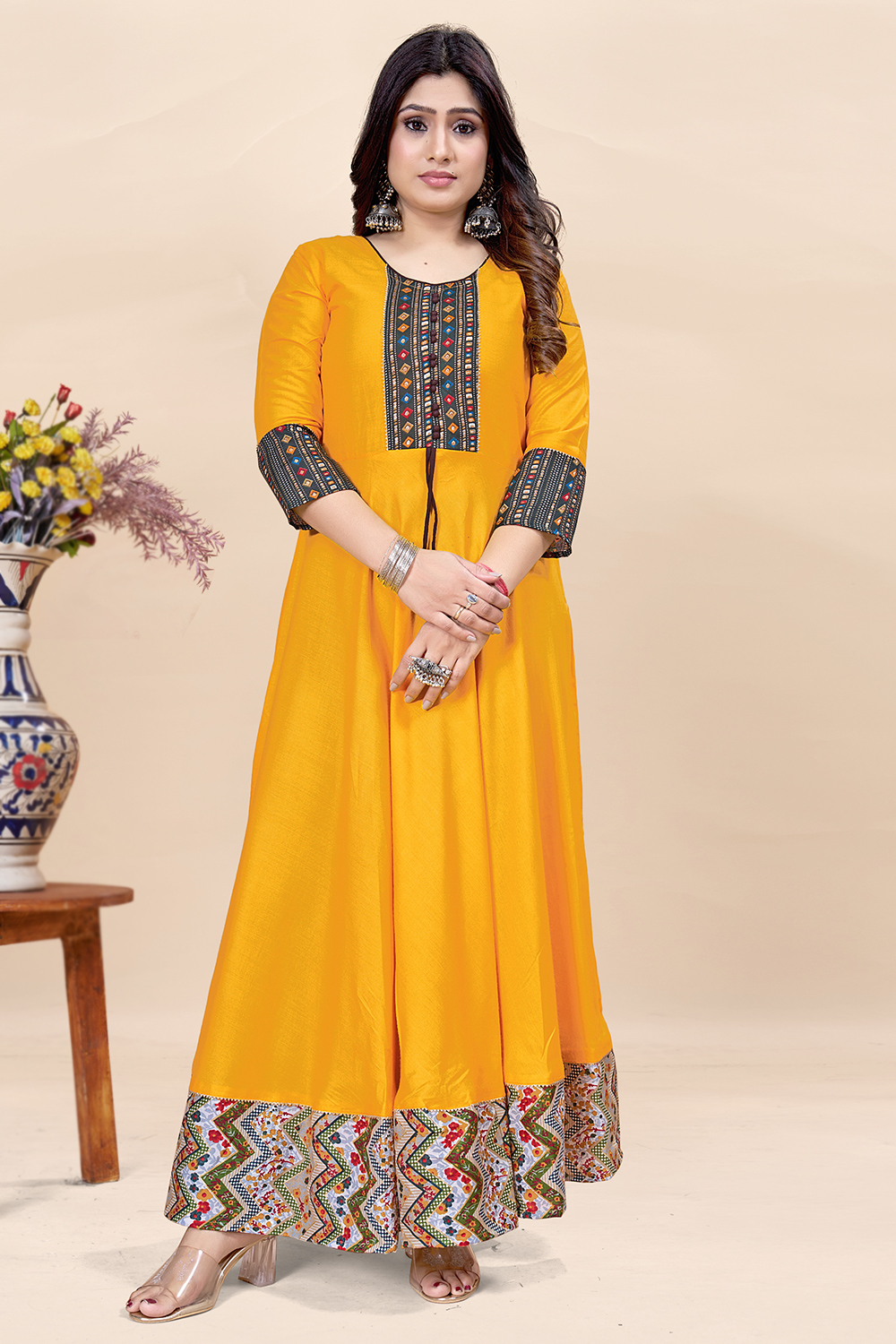 Elevate your wardrobe with this turmeric yellow rayon kurti. Made from rayon, it features a round neck, 3/4 sleeves, and elegant printed and gota patti work. Perfect for casual outings or office wear, it’s available in size 60 inches.